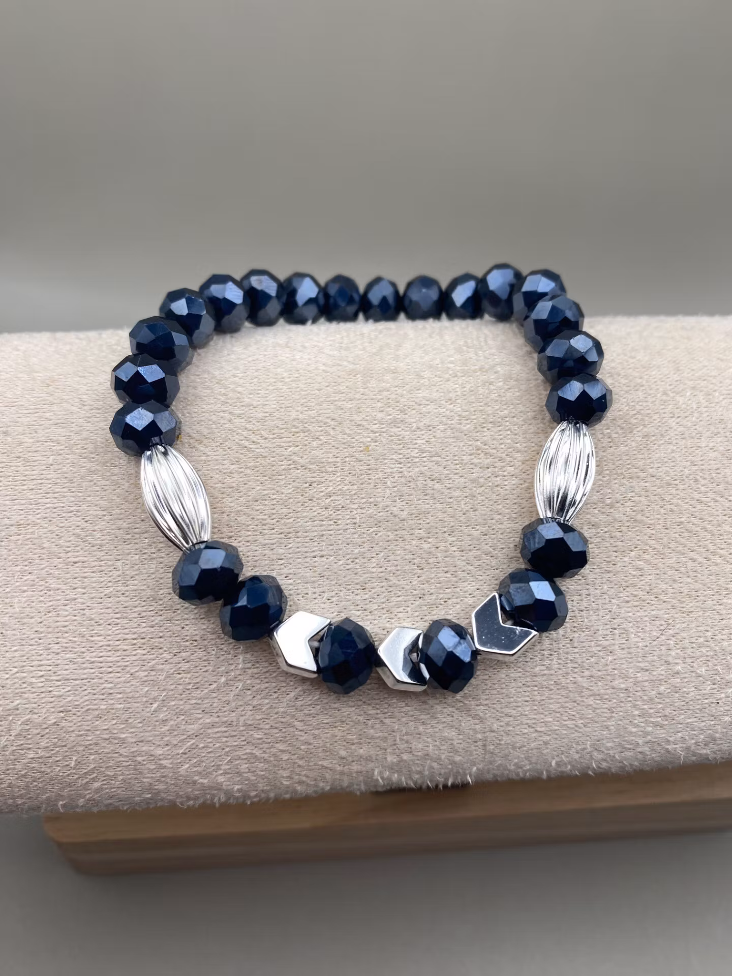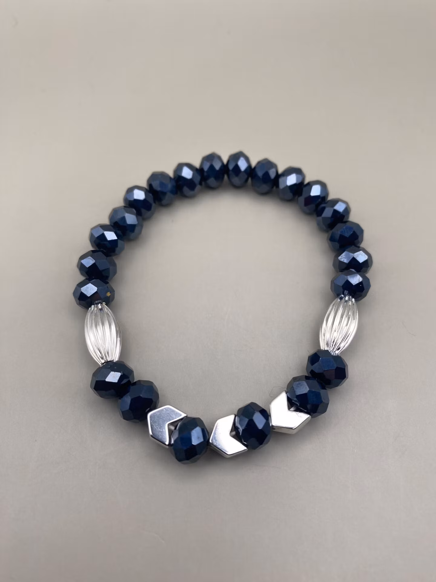Vackert lyxigt skimrande armband i midnattsblåfacetterade glaskristallpärlor varvat i fint mönster med silverfärgade stora mönstrade pärlor och tre silverfärgade pärlor i form av en pil-riktning i blickfånget.