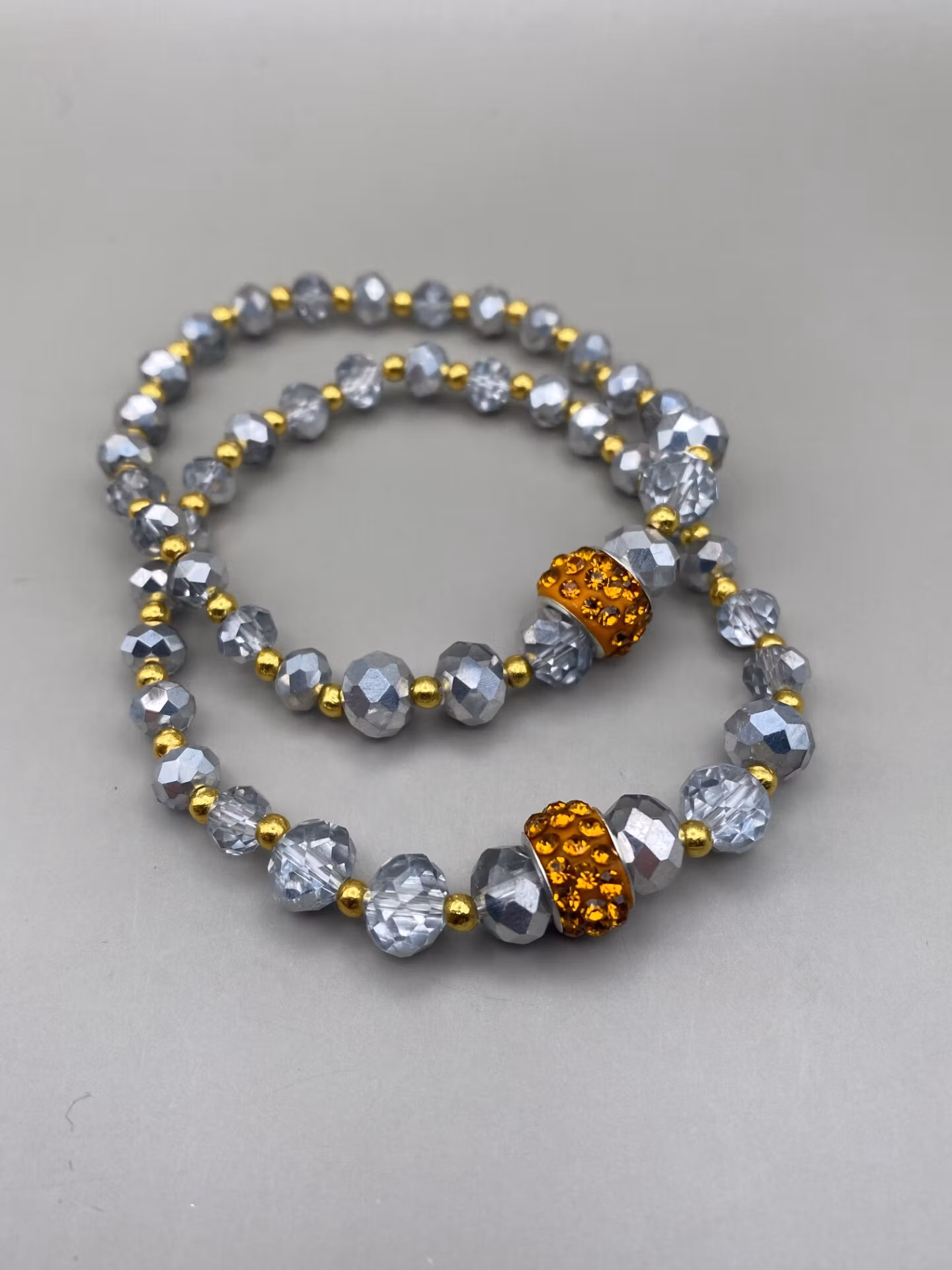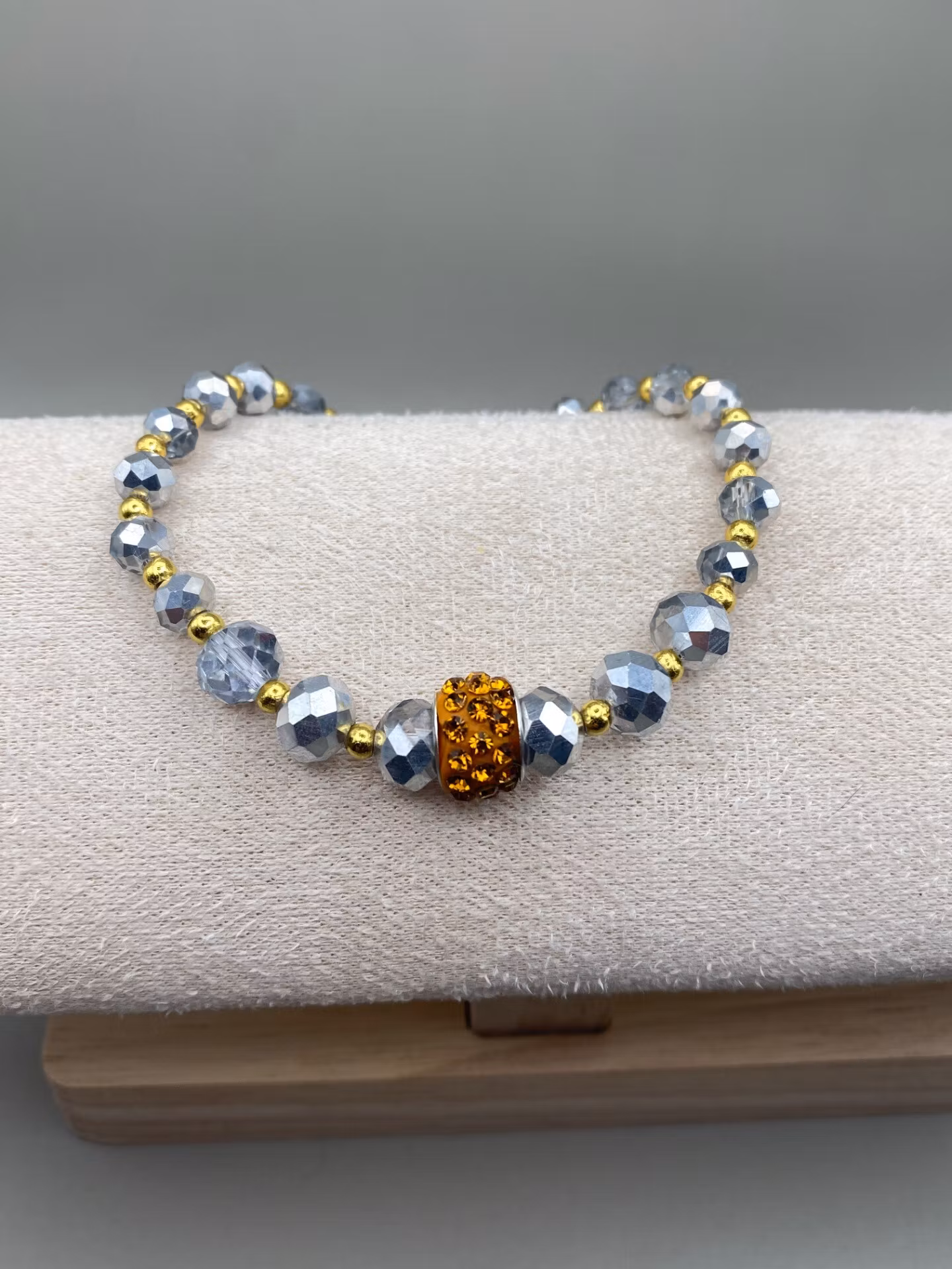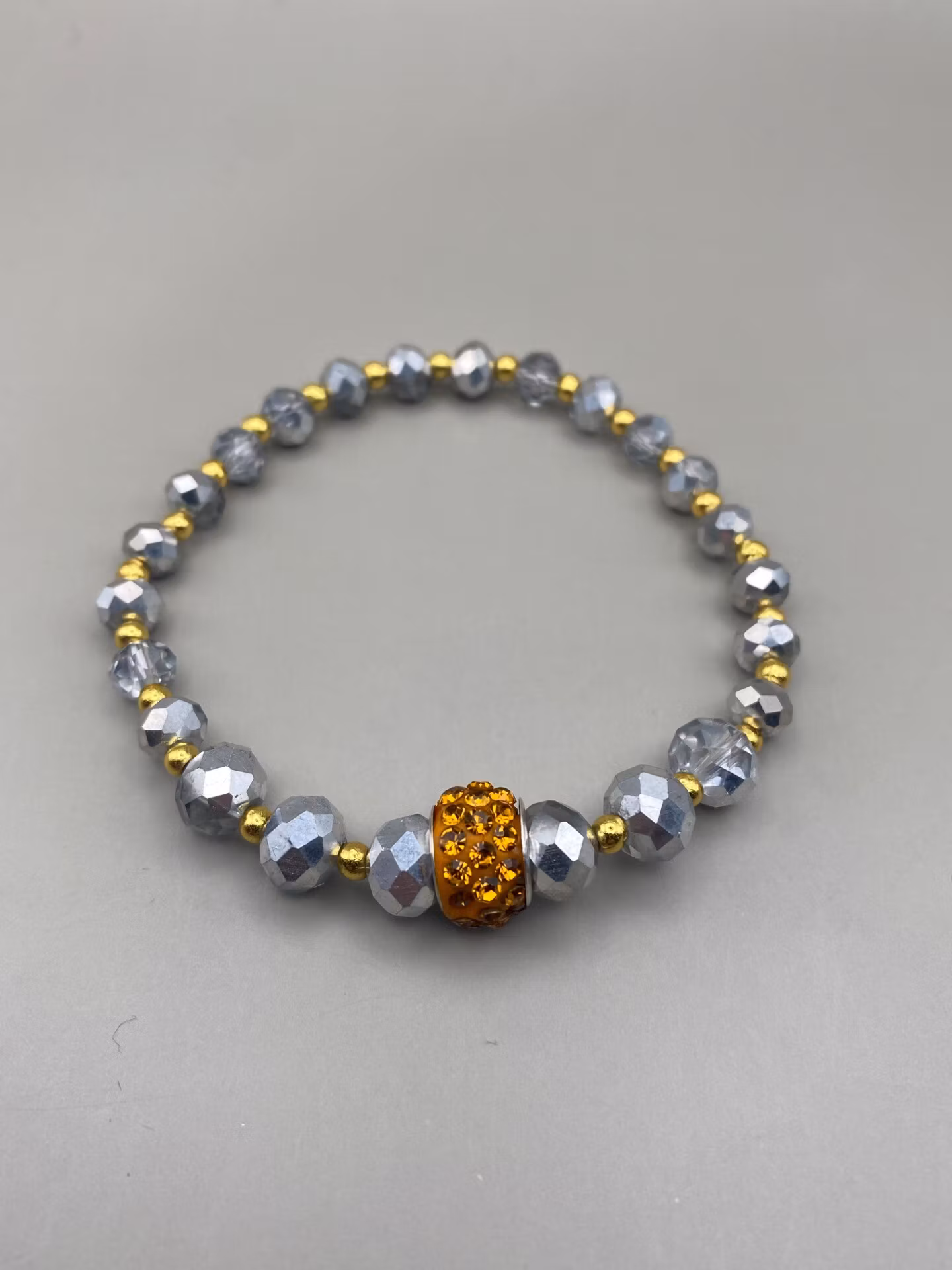 Vackert lyxigt skimrande armband i ljust silvergrå facetterade glaskristallpärlor varvat i fint mönster med guldfärgade små pärlor och stor koppar-orange strass