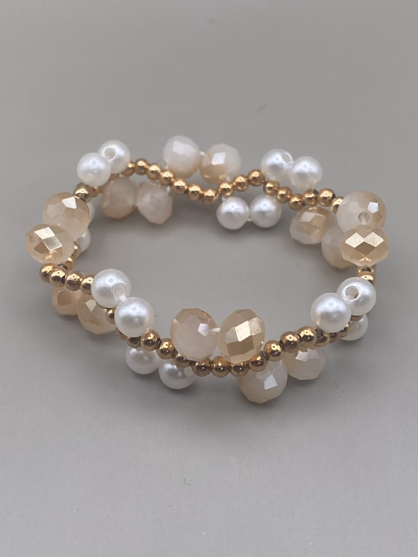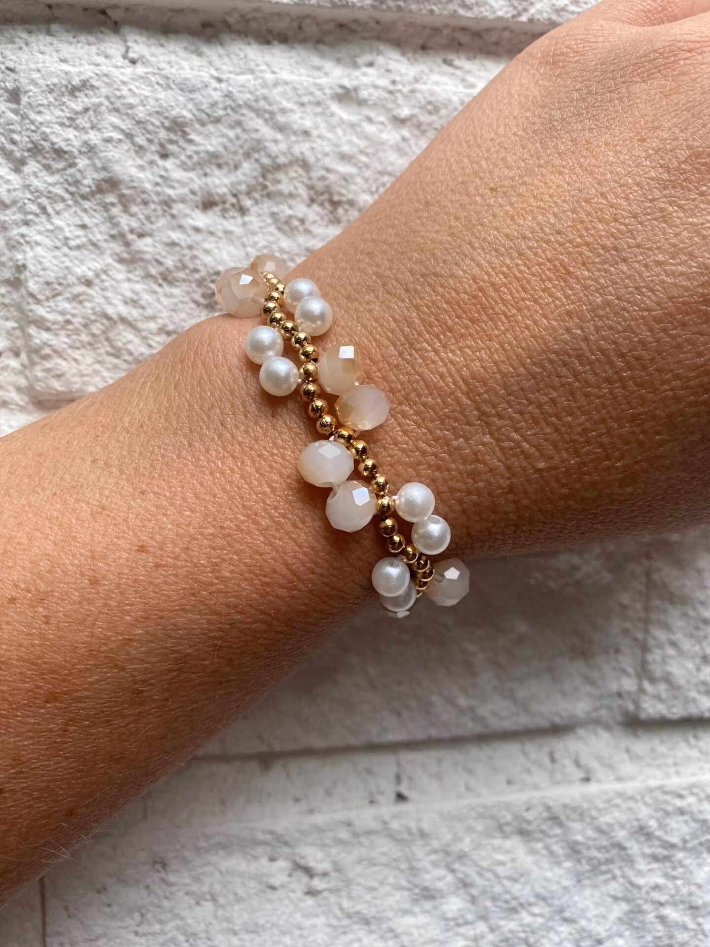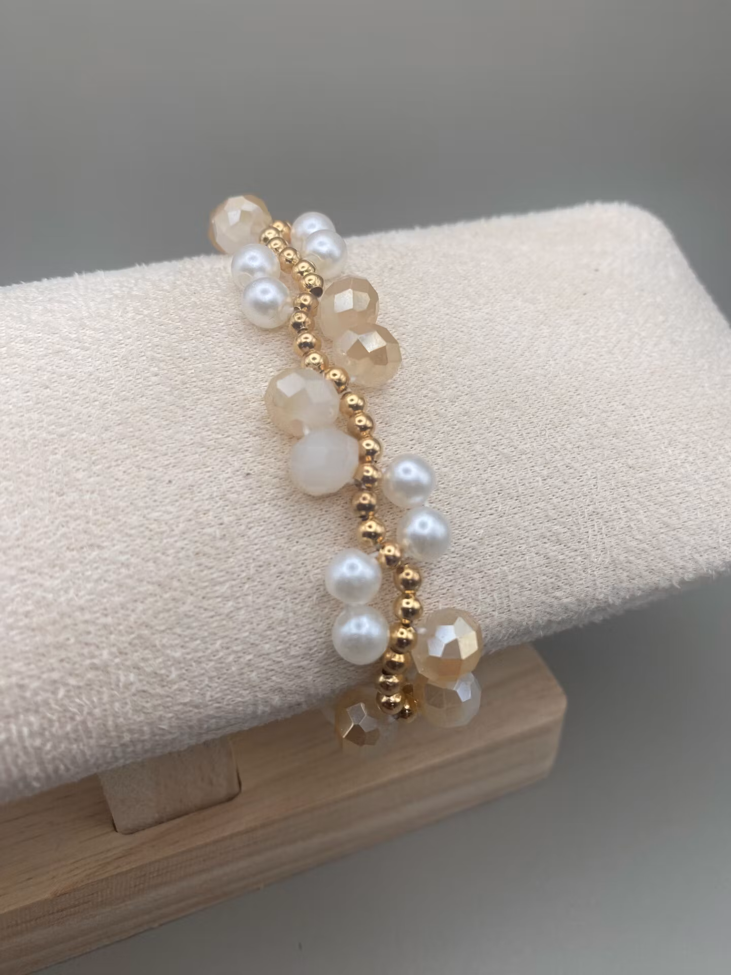 Vackert stilrent treradigt armband av i vackert varvat mönster av kritvita högblanka pärlor, beige mellerade glaskristallpärlor och små guldfärgade pärlor.