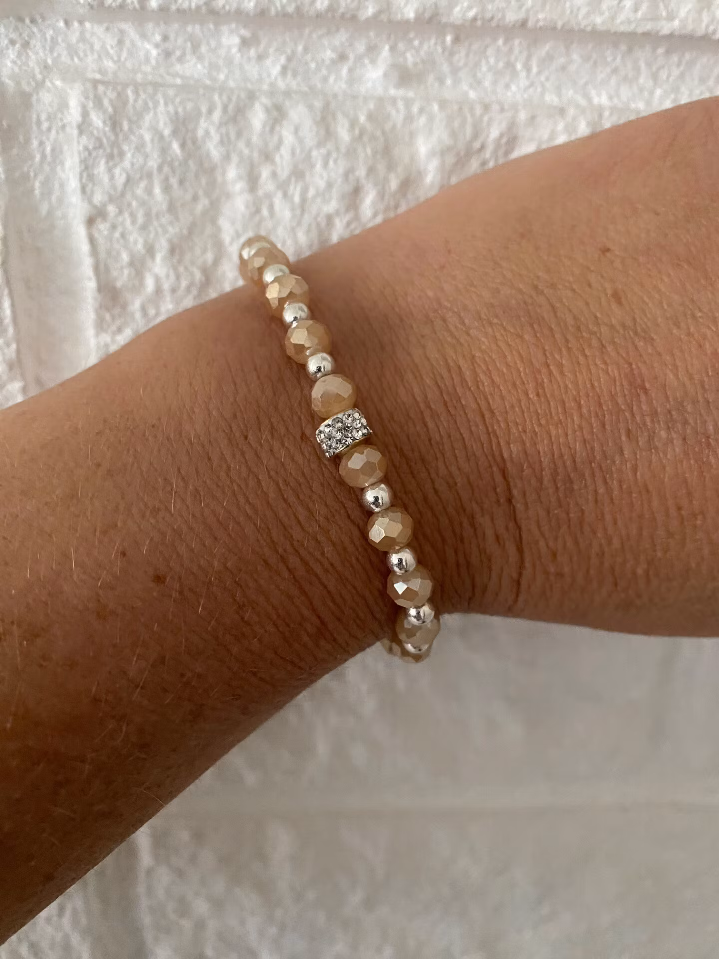 Vackert stilrent armband i lattefärgade facetterade glaskristall pärlor varvat med små silverfärgade pärlor och vacker strass i blickfånget och avslutspärla med