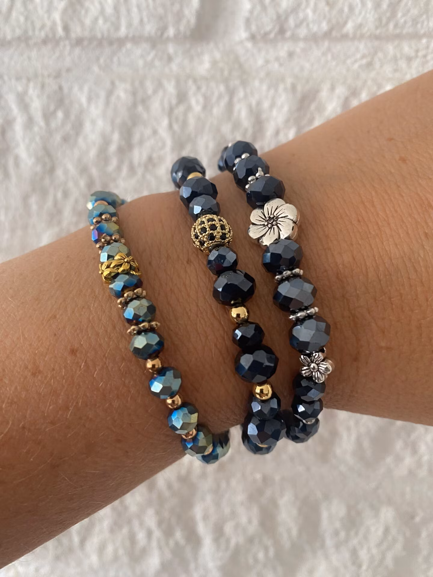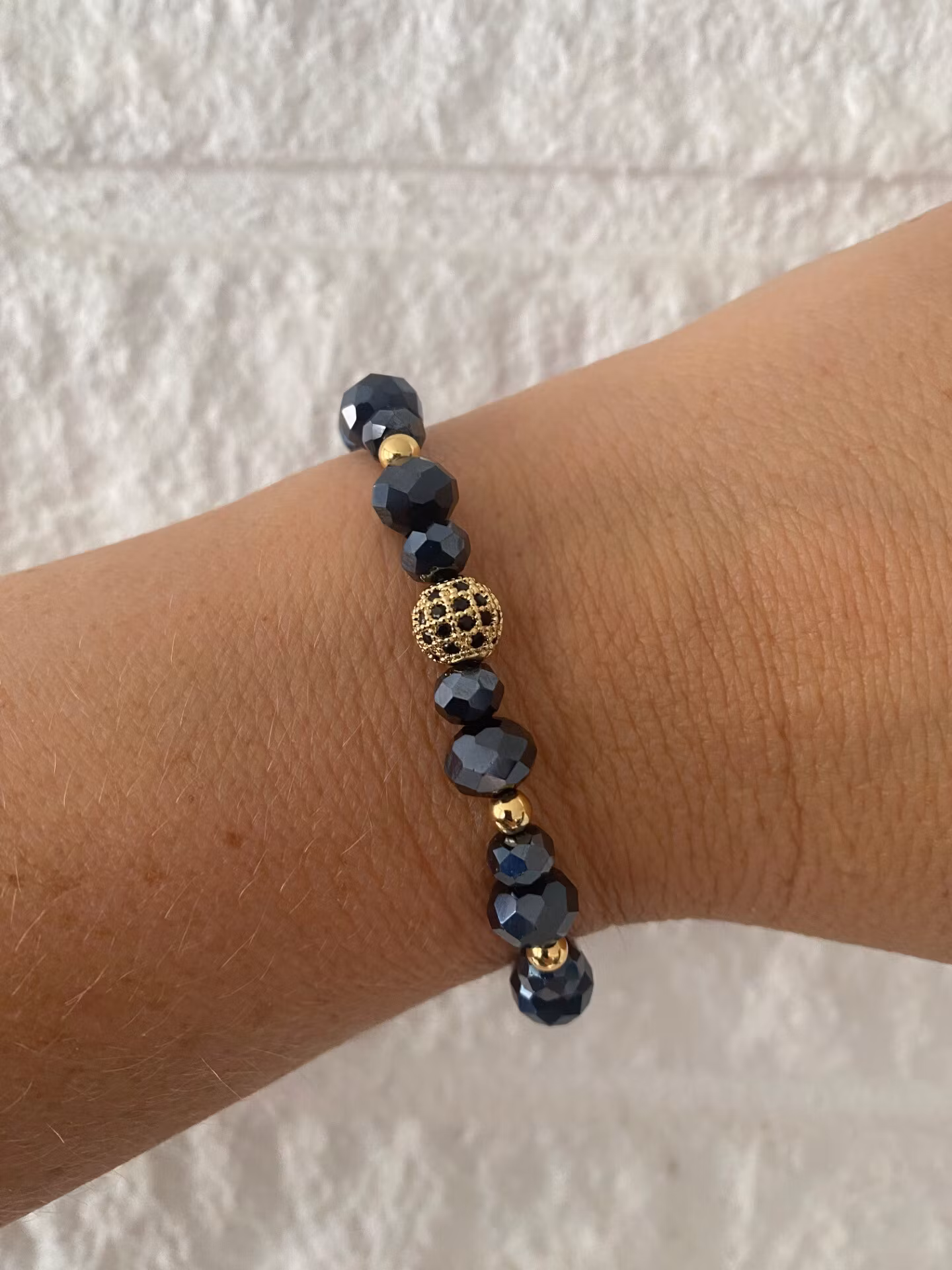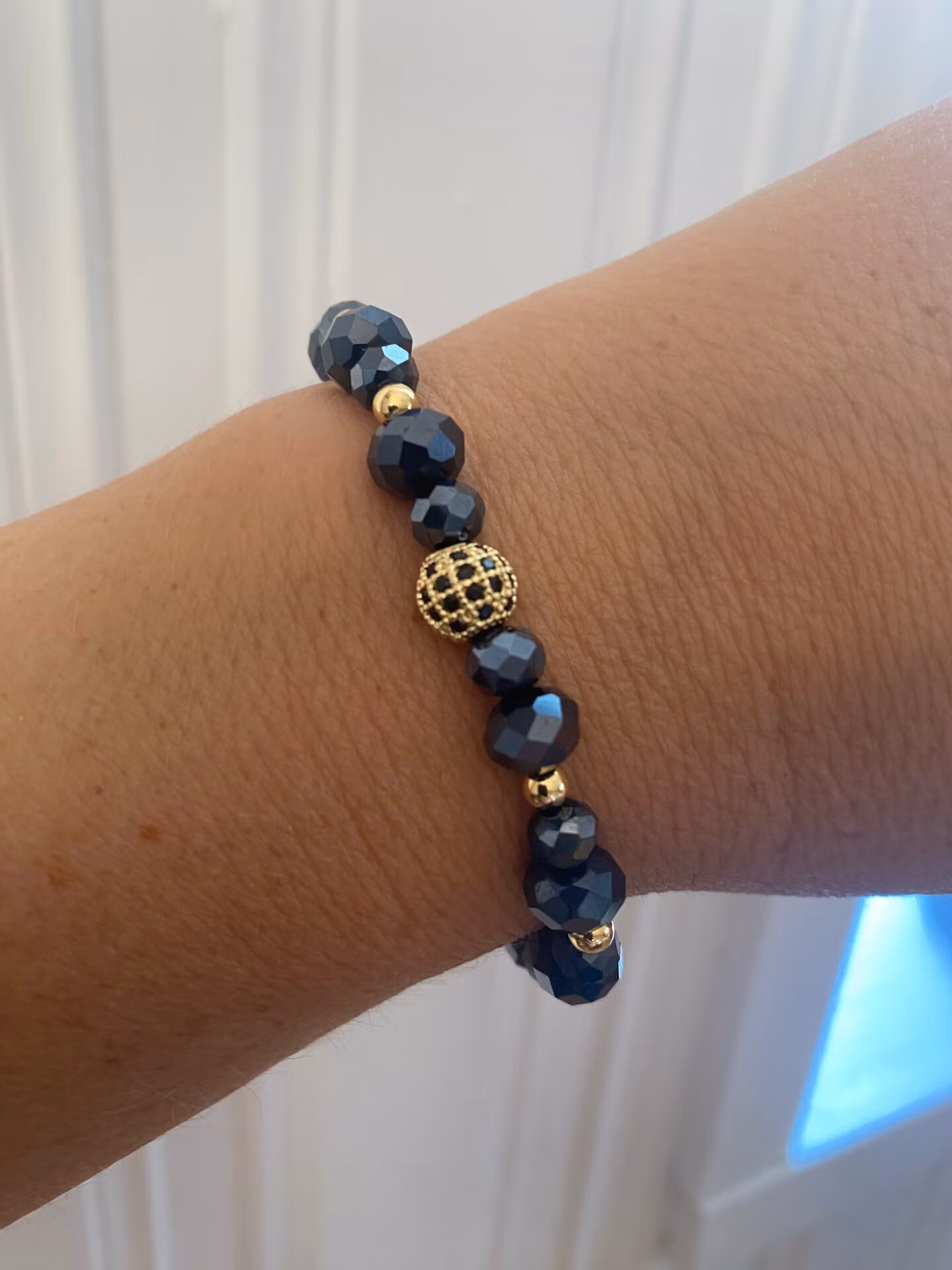 Vackert armband i midnattsblå högblanka facetterade glaskristallpärlor och en vacker guldfärgad pärla som detalj i blickfånget.