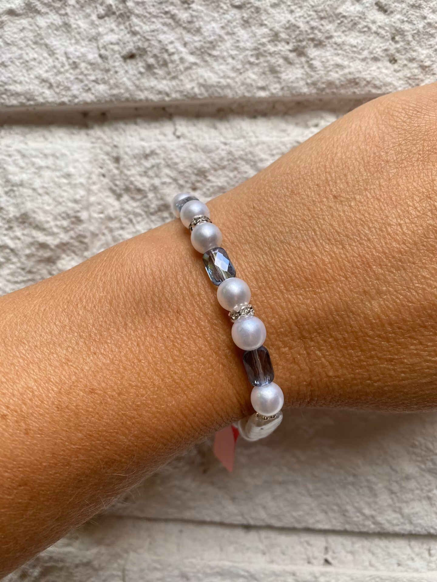Vackert armband i stora högblanka kritvita pärlor i olika storlekar i vackert mönster med strass och tre ljusblå avlånga facetterade glaspärlor samt strass i bl
