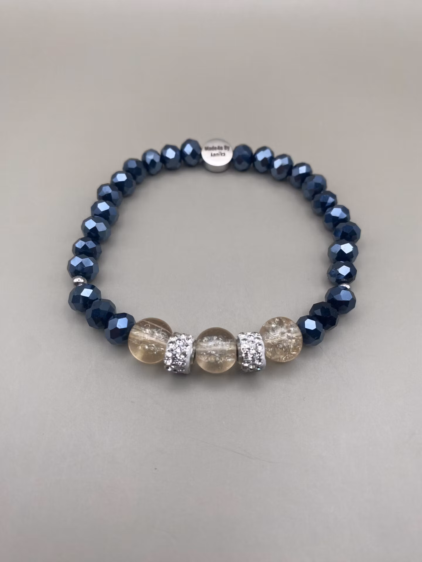 Vackert armband med mellanstora midnattsblå högblanka facetterade glaskristallpärlor runt om. Champagnefärgade runda glaspärlor varvat med strass i blickfånget.