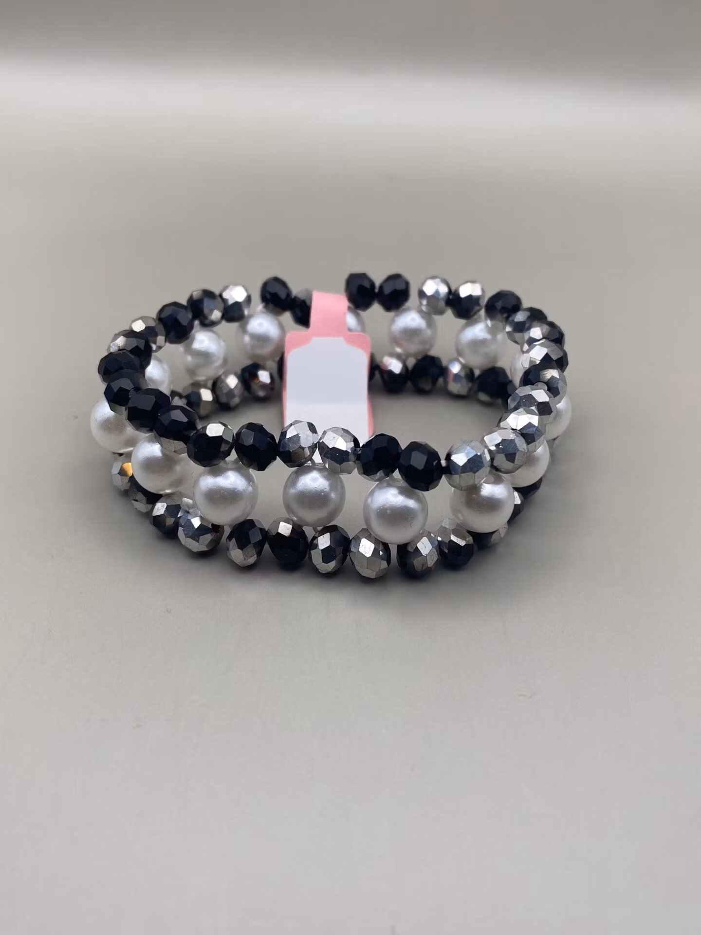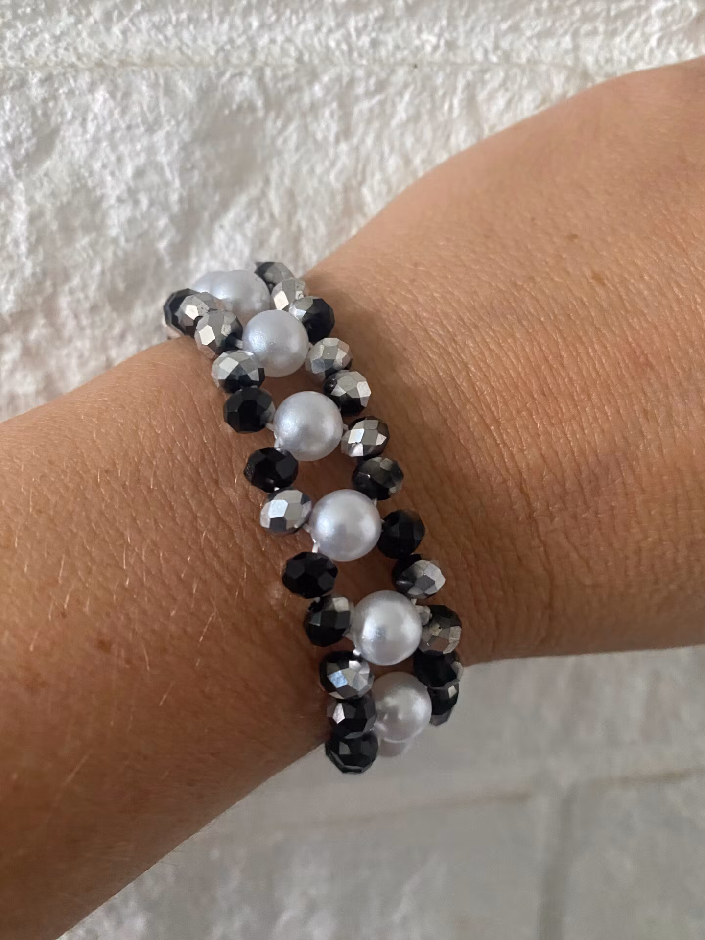 Vackert och lite tufft treradigt armband i varvat mönster av svart och silvermellerade facetterade glaskristallpärlor och stora kritvita högblanka pärlor.