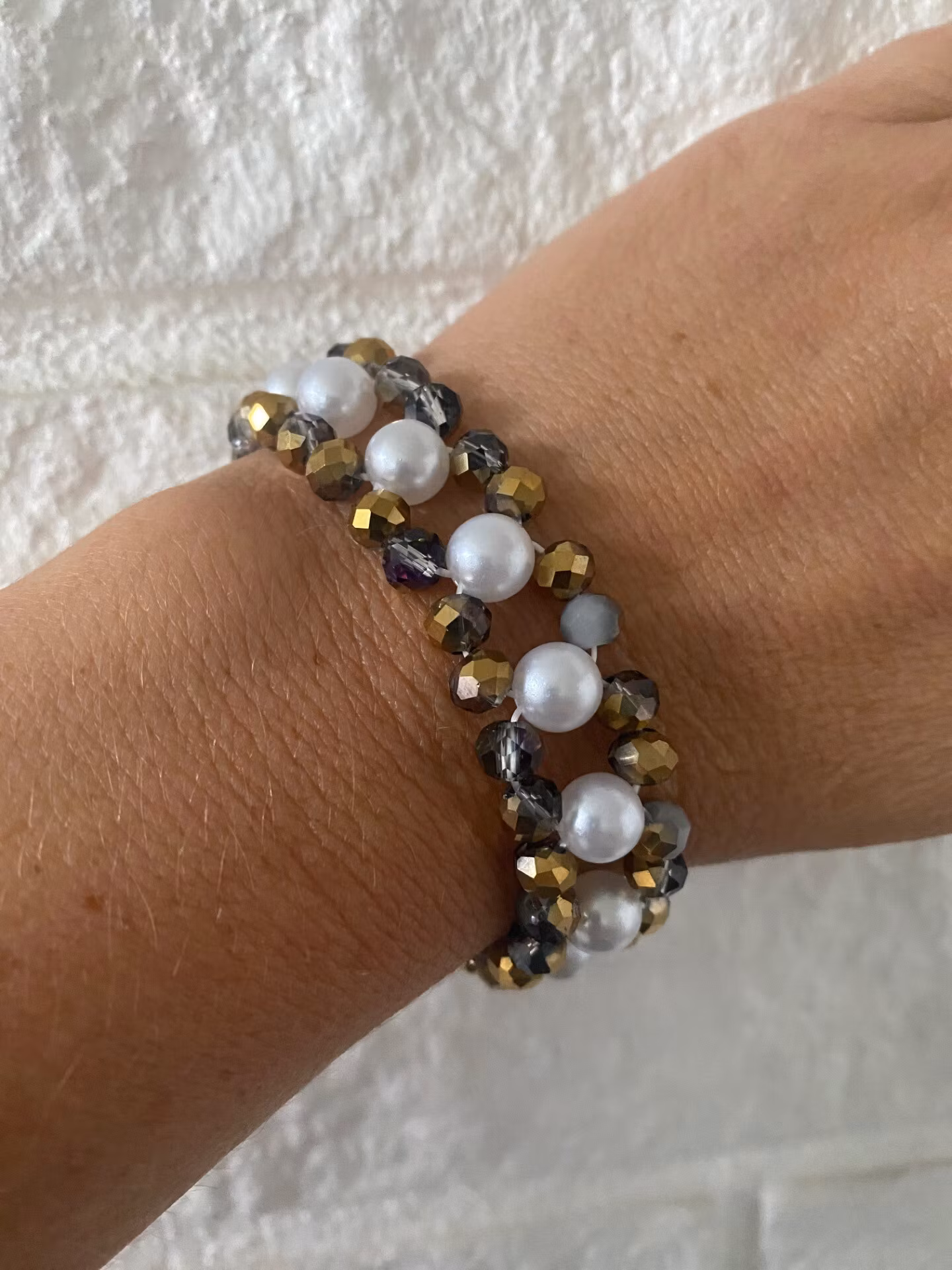 Vackert och lite tufft treradigt armband i varvat mönster av grå- och guldmellerade facetterade glaskristallpärlor och stora kritvita högblanka pärlor.