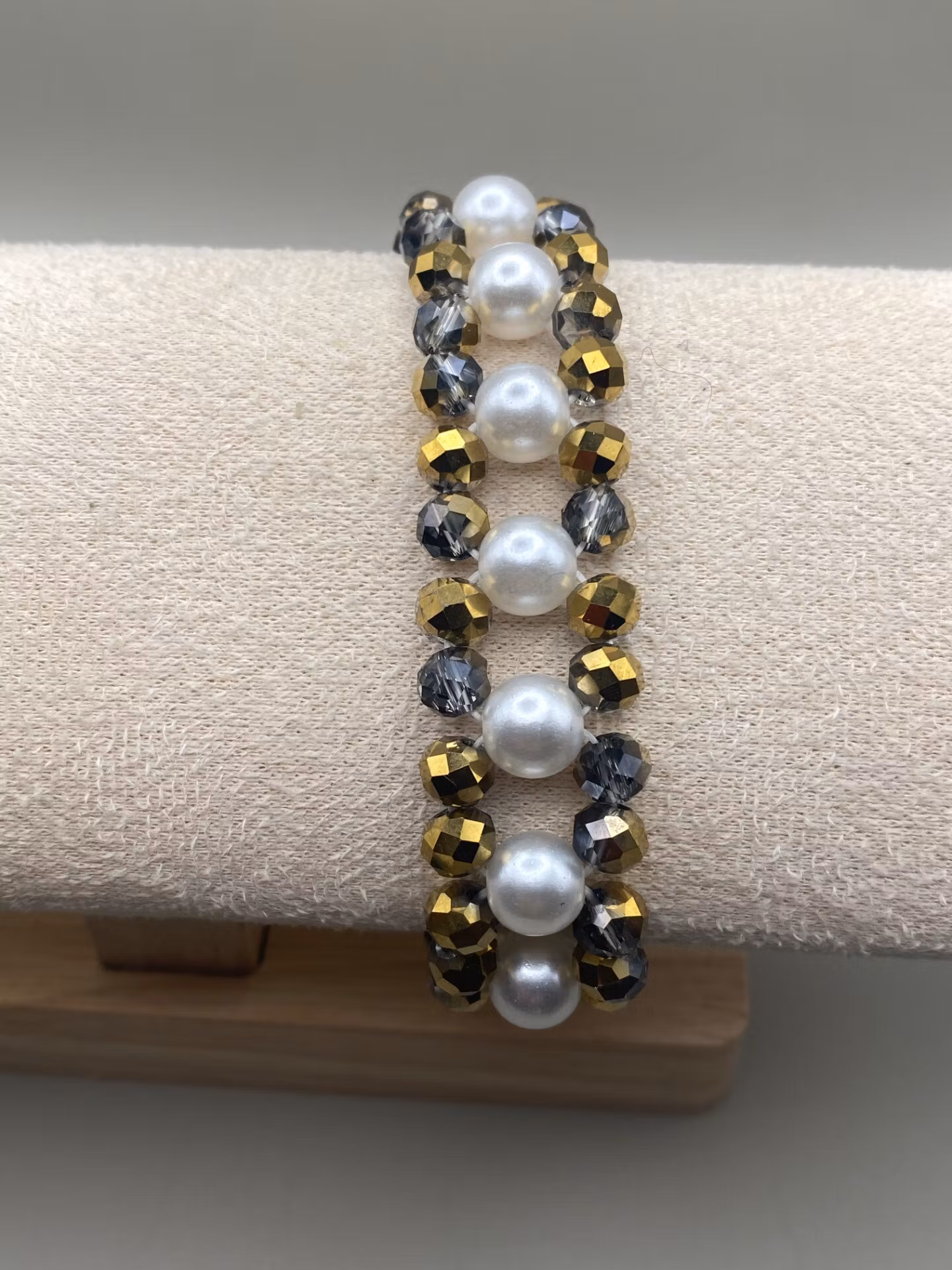 Vackert och lite tufft treradigt armband i varvat mönster av grå- och guldmellerade facetterade glaskristallpärlor och stora kritvita högblanka pärlor.Pärlor: 8