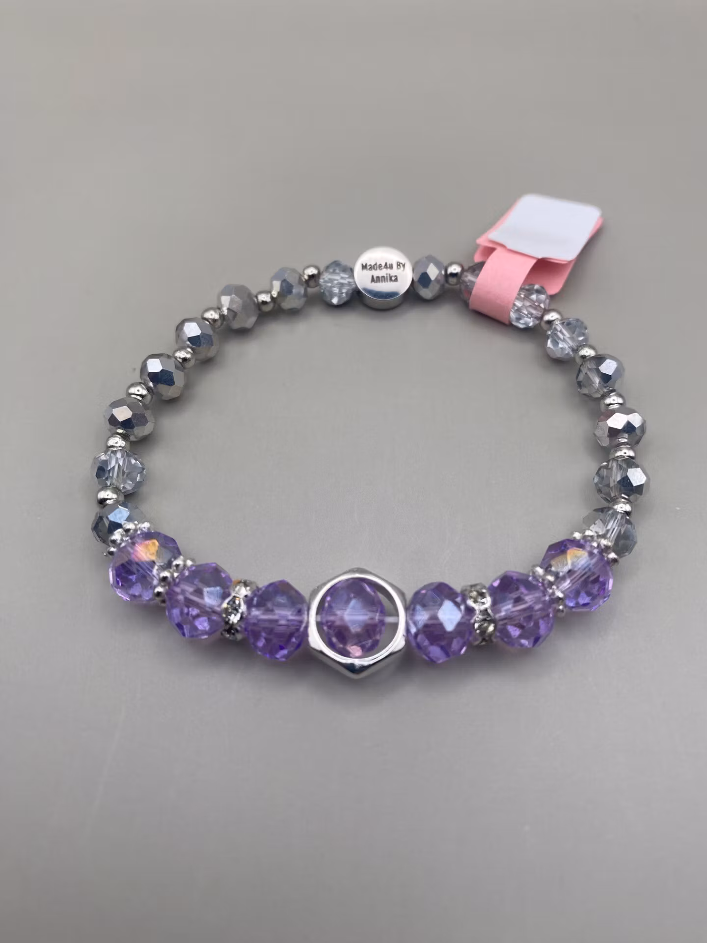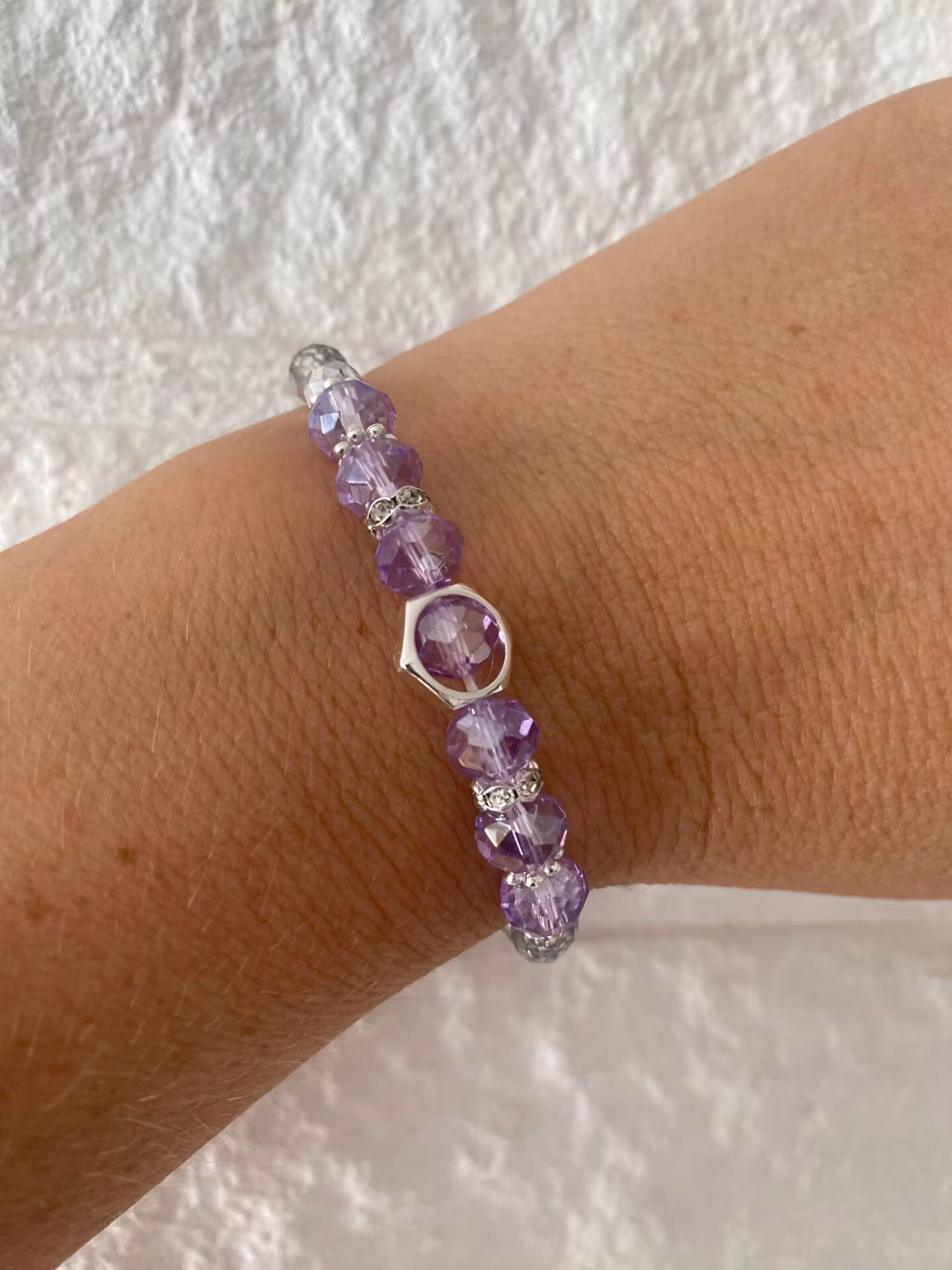 Vackert armband i höglblanka silverfärgade facetterade glaskristallpärlor och större ljuslila glaskristallpärlor och ett silverfärgat sexkantigt hölje kring stö