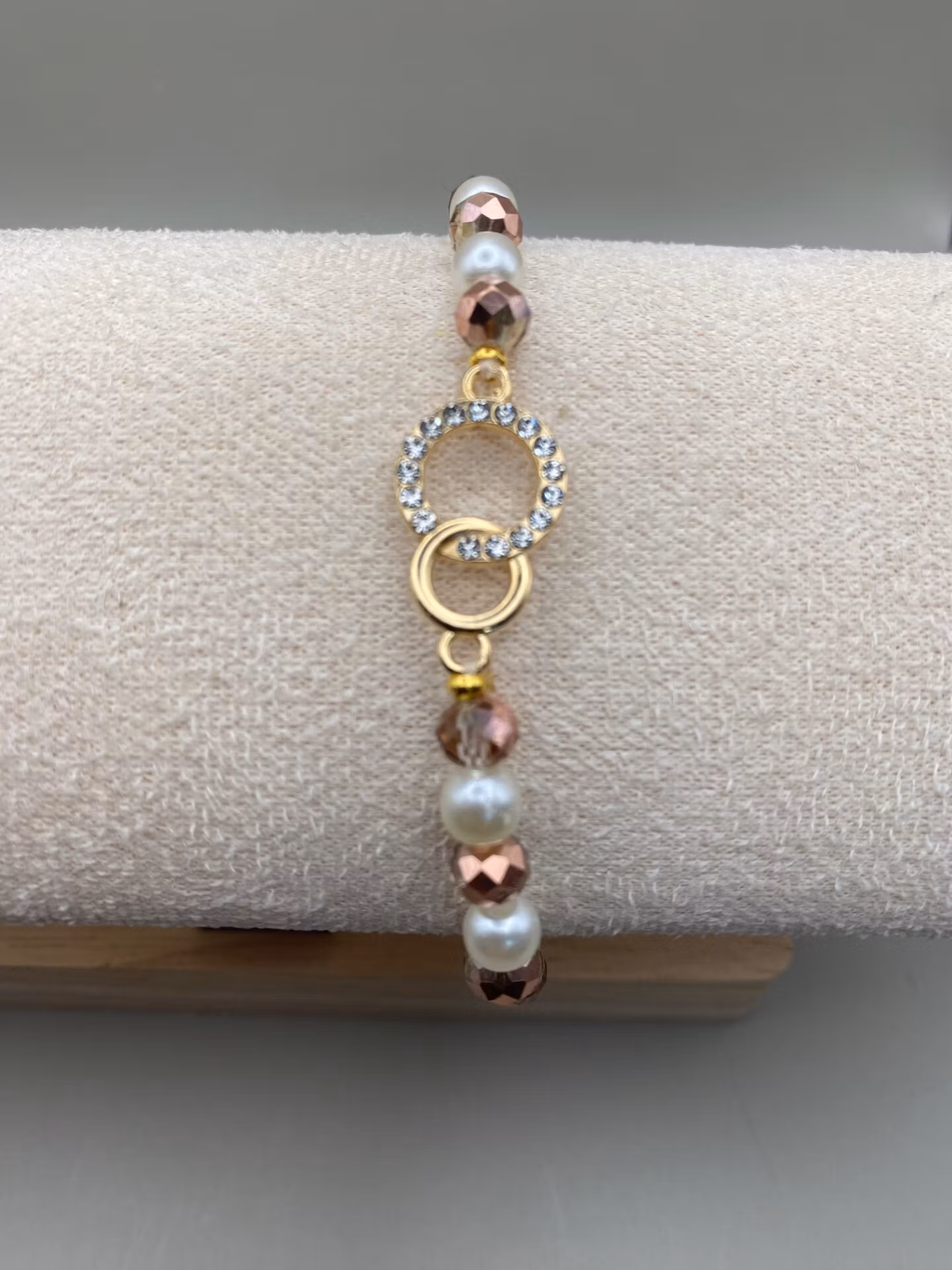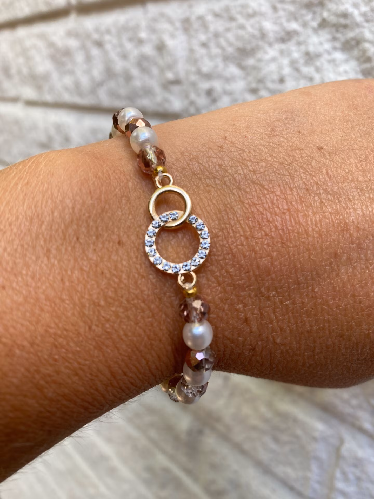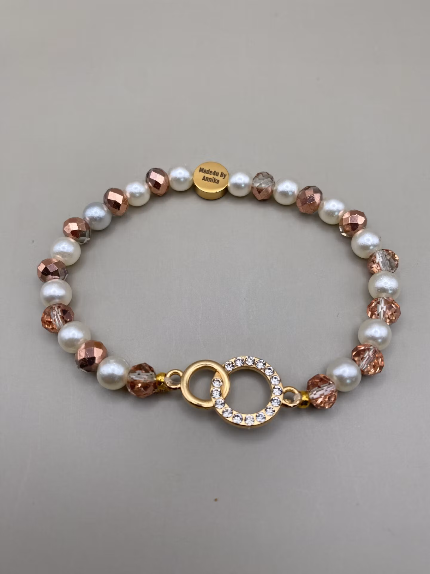 Vackert armband i varvat högblanka benvita pärlor och aprikosmellerade spegelblanka facetterade glaskristallpärlor och en vacker berlock med strass i blickfånge