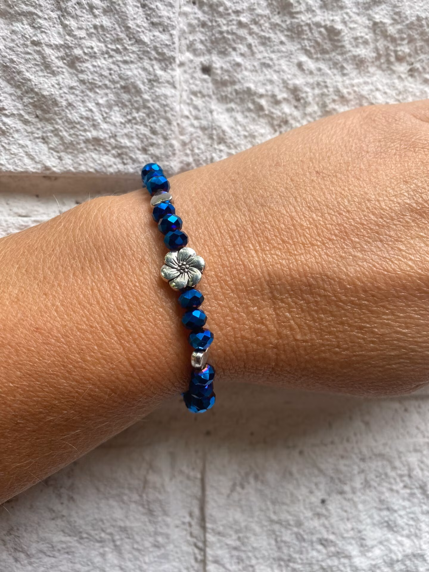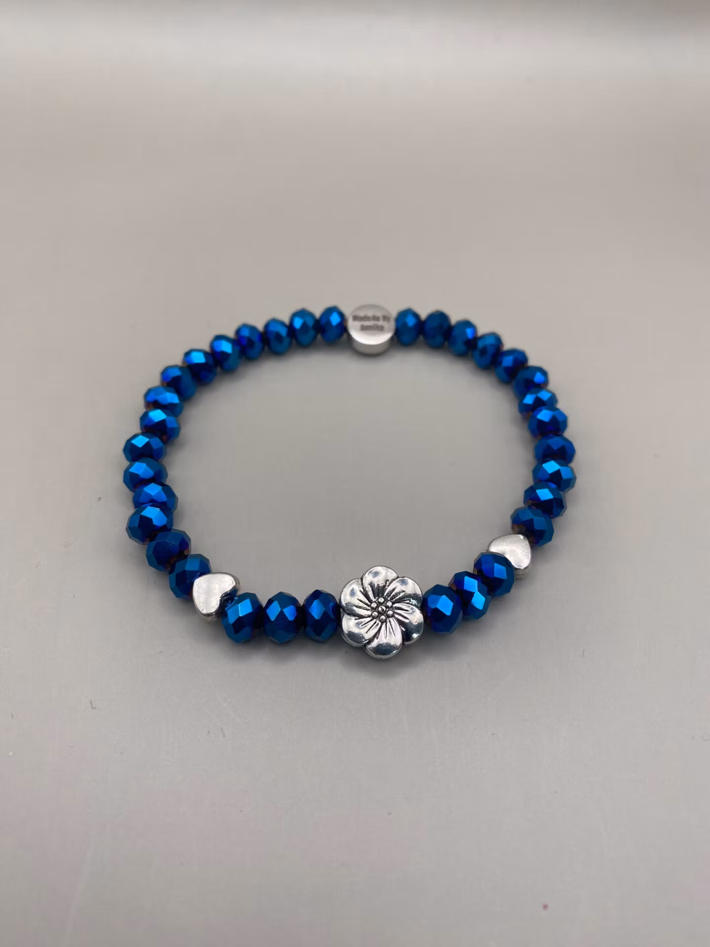 Vackert armband i spegelblanka havsblå facetterade glaskristallpärlor, silverfärgade små hjärtan och vacker blomma i blickfånget.