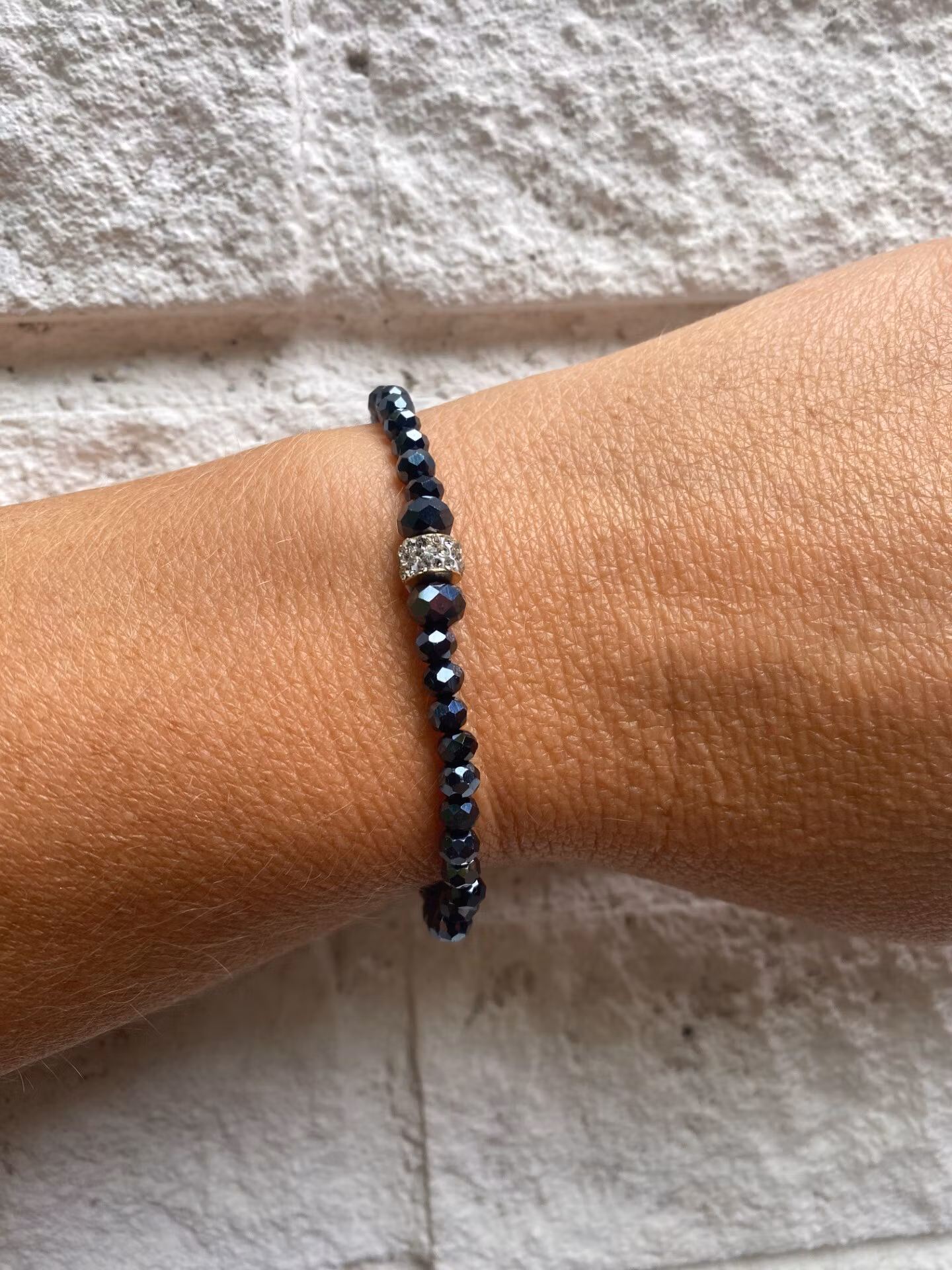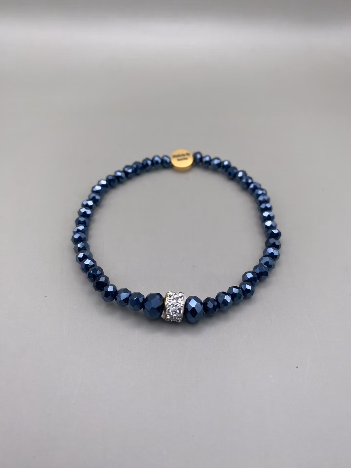 Vackert armband i spegelblanka midnattsblå facetterade glaskristallpärlor och vacker strass i blickfånget.
