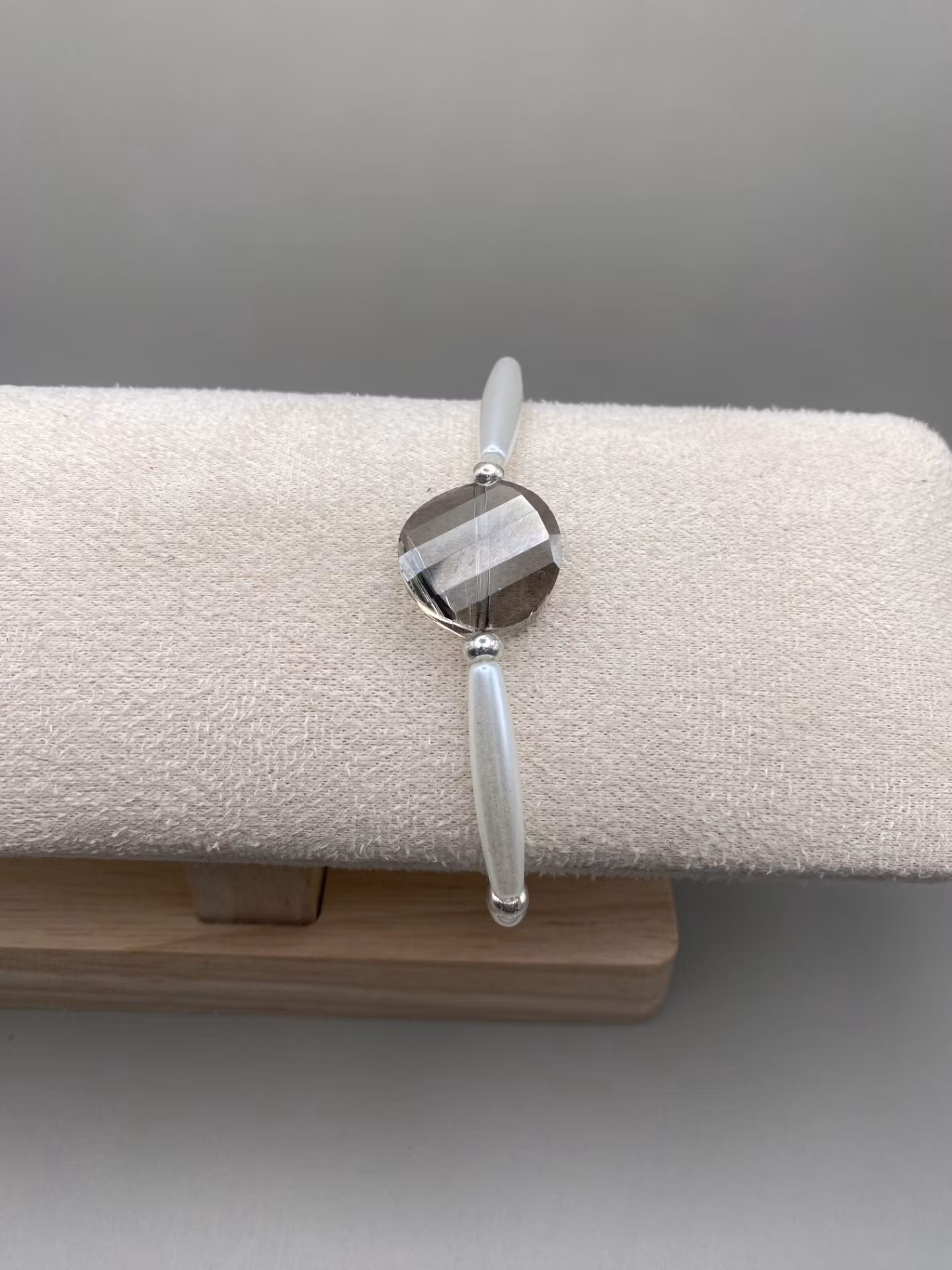 Stiligt armband som sticker ut, avlånga kritvita högblanka pärlor runt om varvat med små silverfärgade glaspärlor, stor facetterad grå glaspärla i blickfånget.