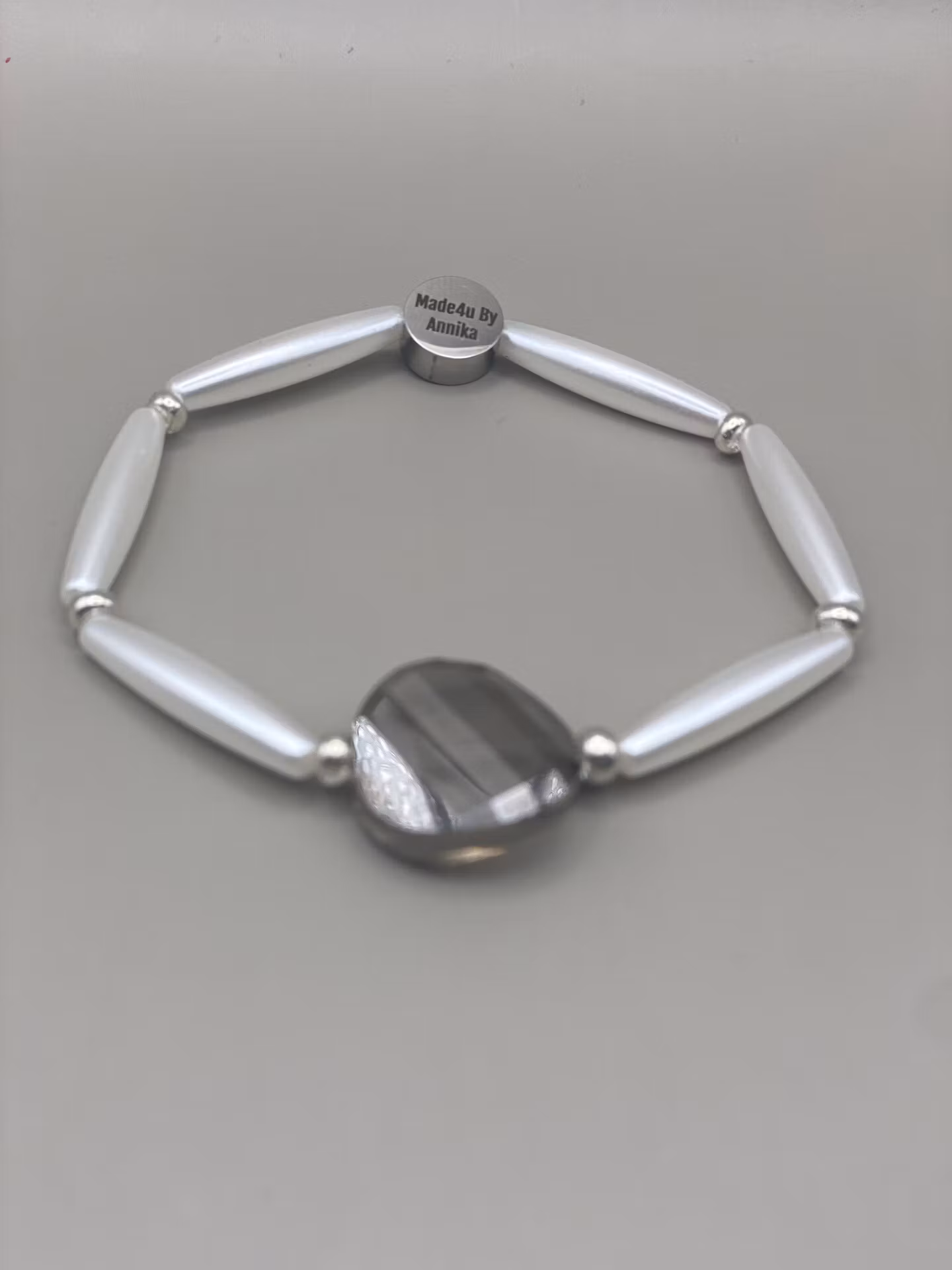 Stiligt armband som sticker ut, avlånga kritvita högblanka pärlor runt om varvat med små silverfärgade glaspärlor, stor facetterad grå glaspärla i blickfånget.P