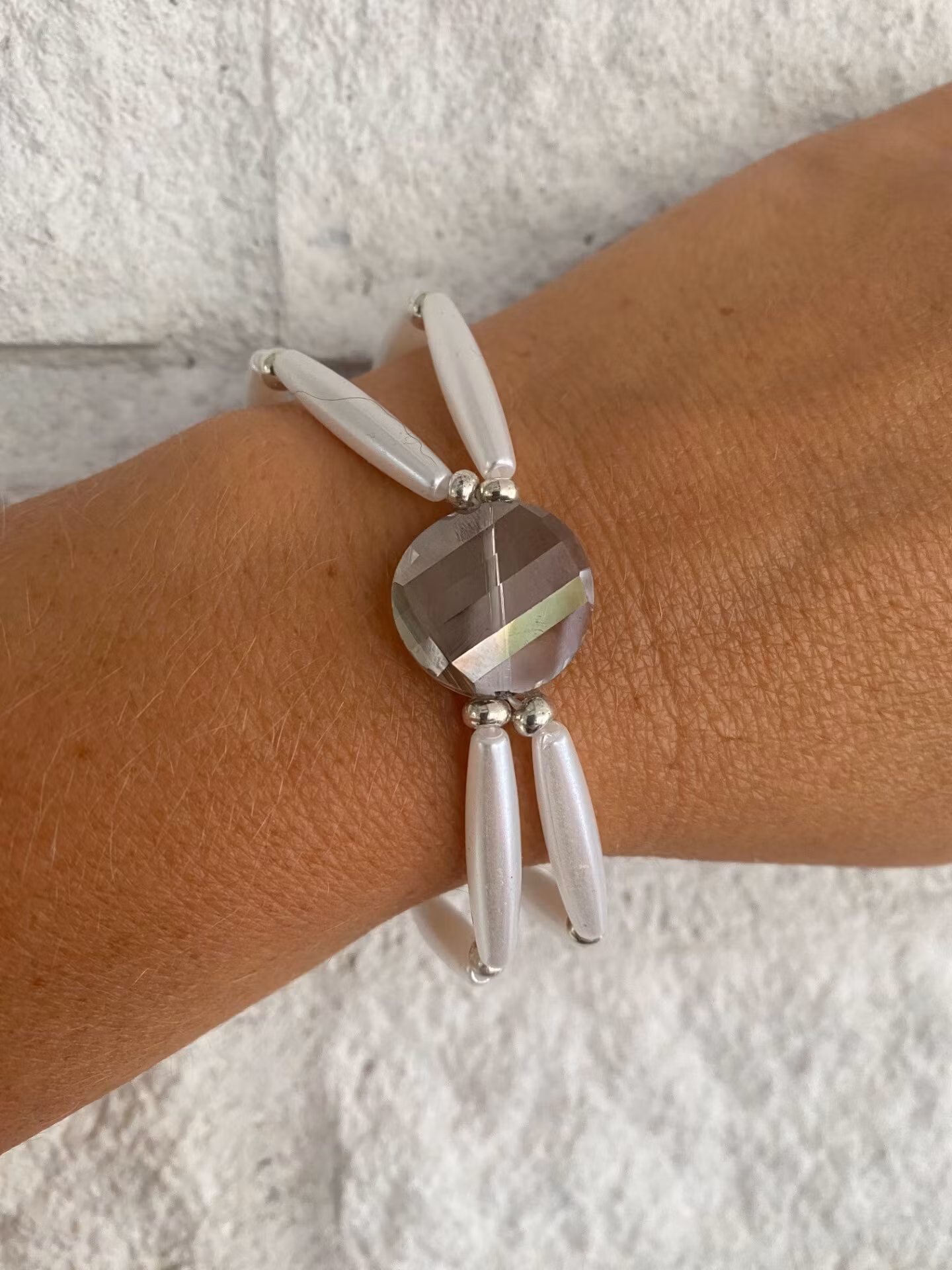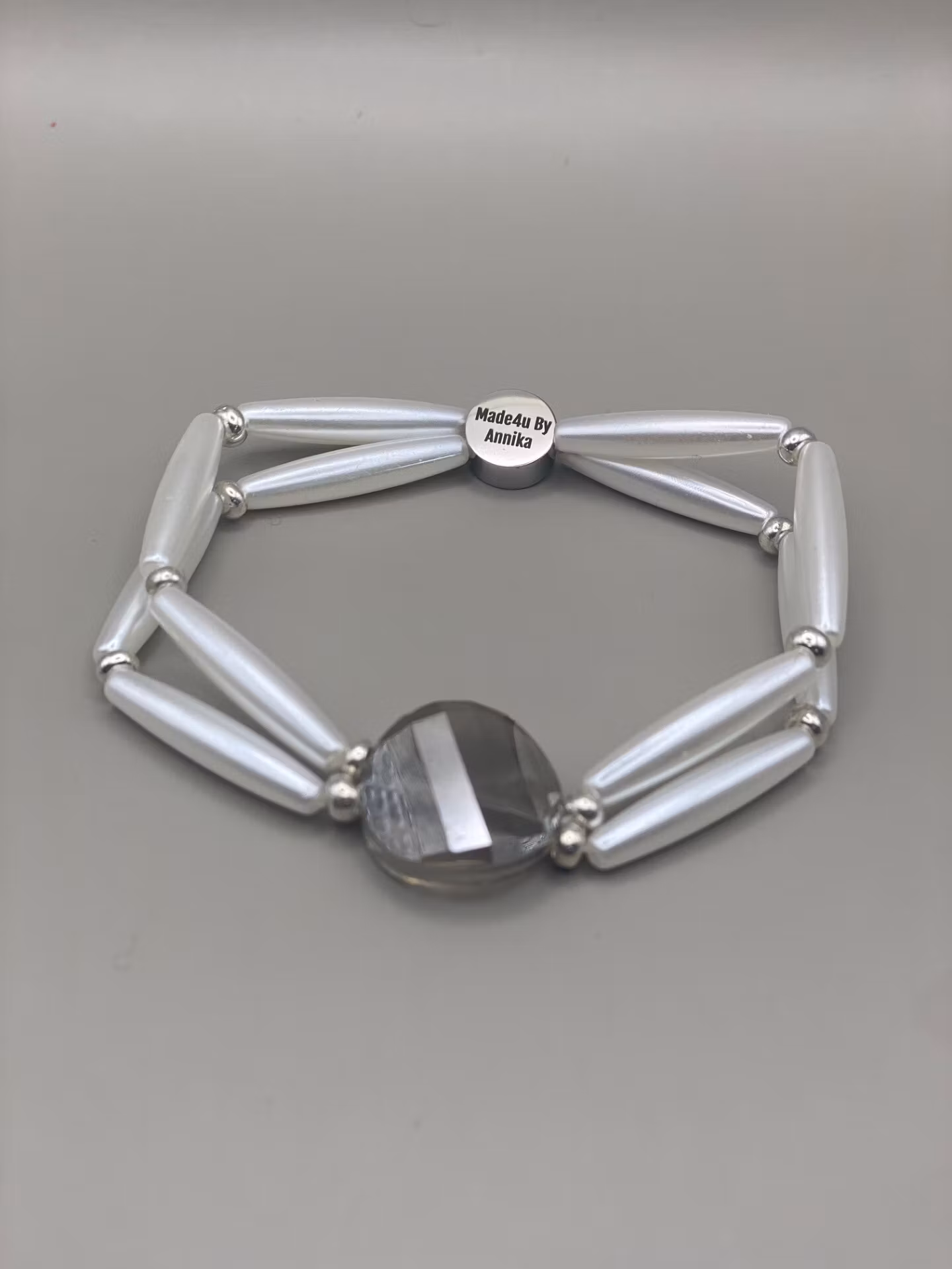 Stiligt armband som sticker ut, två radigt avlånga kritvita högblanka pärlor runt om varvat med små silverfägade glaspärlor, stor facetterad grå glaspärla i blickfånget.