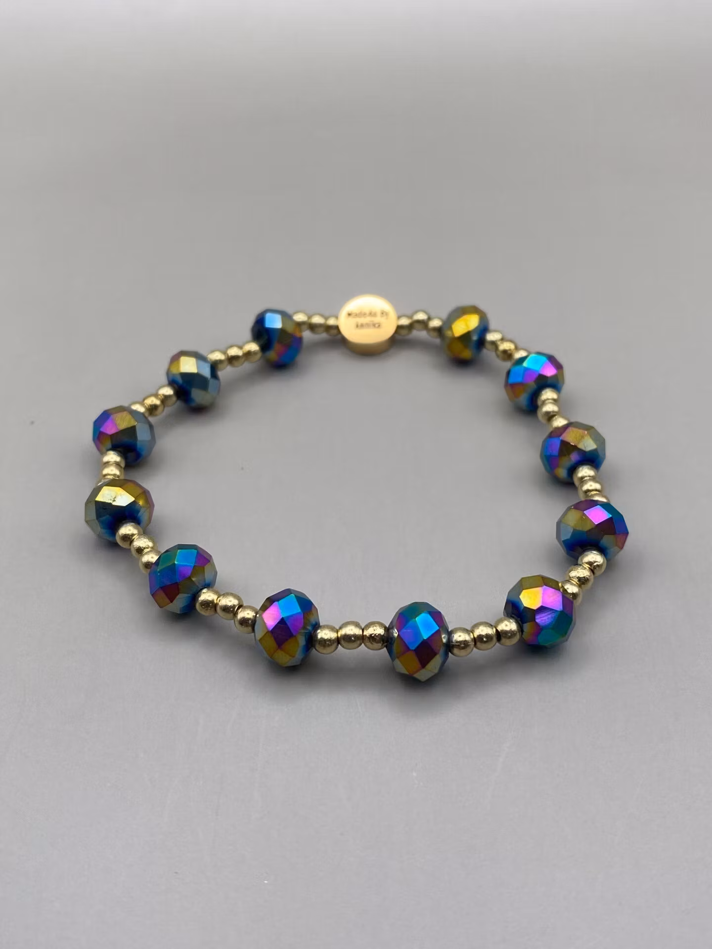 Vackert och lyxigt armband i fint mönster av flerfärgade spegelblanka facetterade glaskristallpärlor och små guldfärgade pärlor.Pärlor: 8mm, 3mmVisas produkten