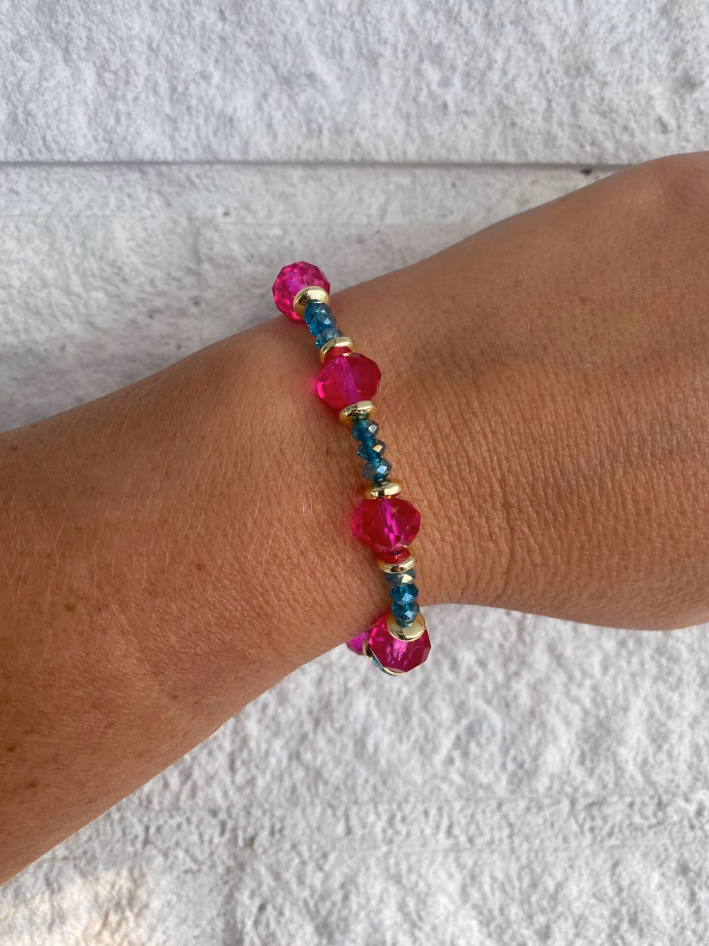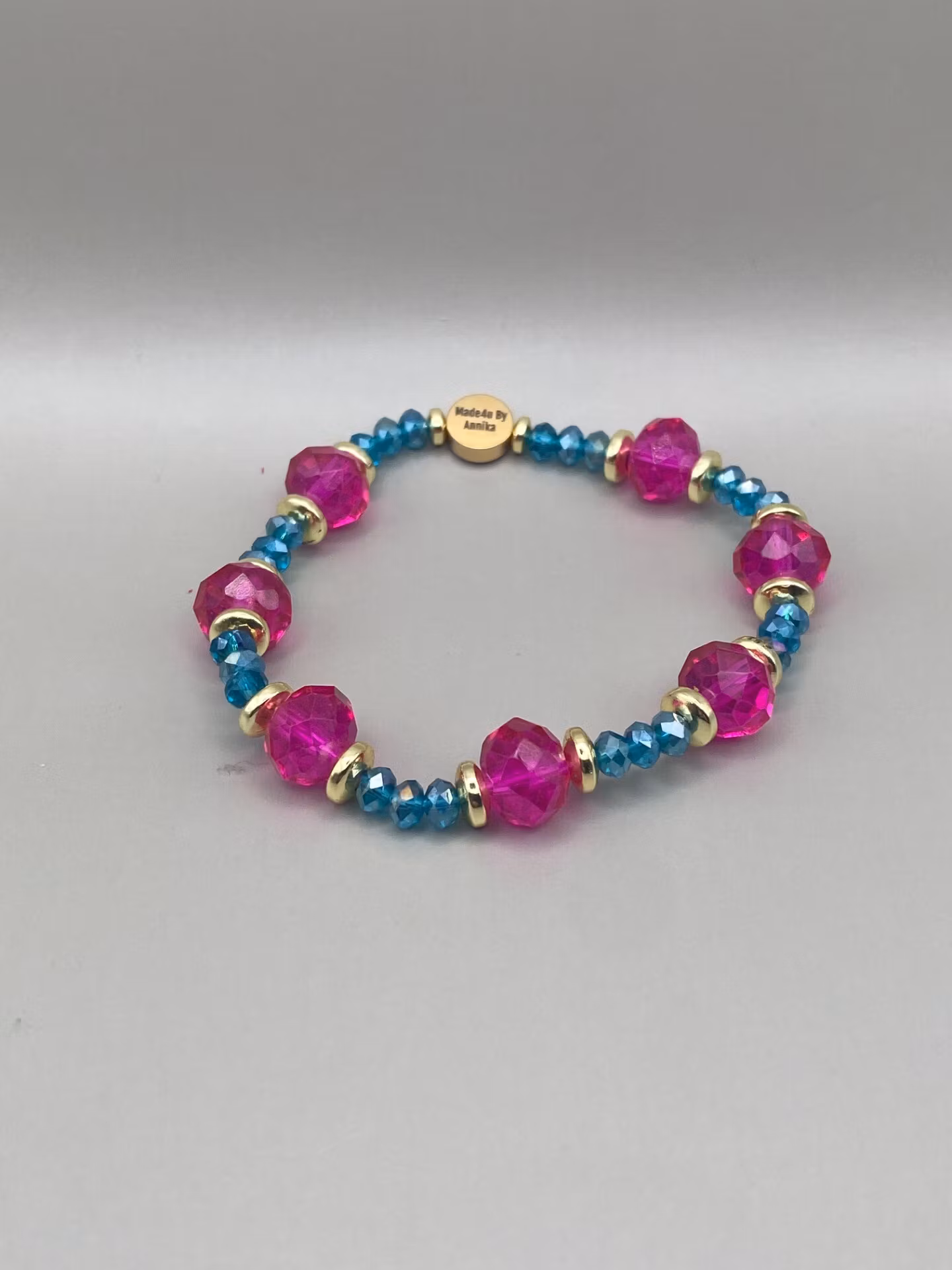 Vackert och lekfullt amband i varvat mönster av stora knallrosa och små turkosmellerade glaskristallpärlor samt guldfärgade distanser i 18K guldpläterad hematit och avslutspärla med signatur.