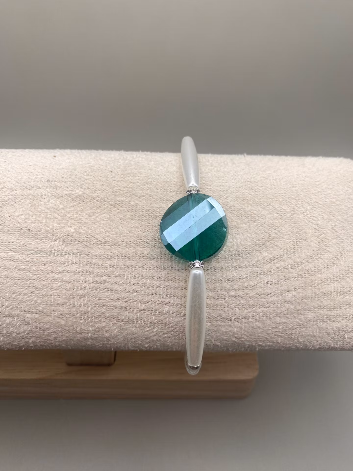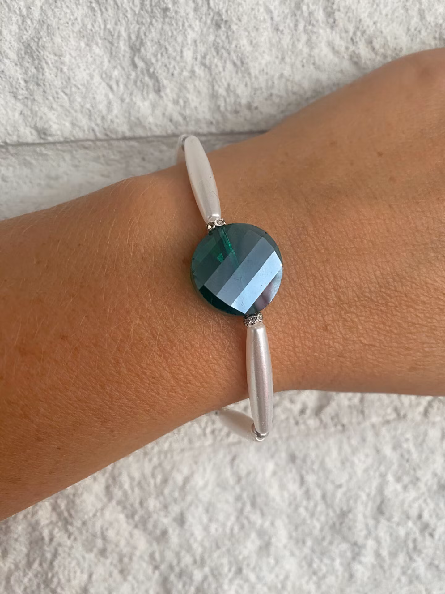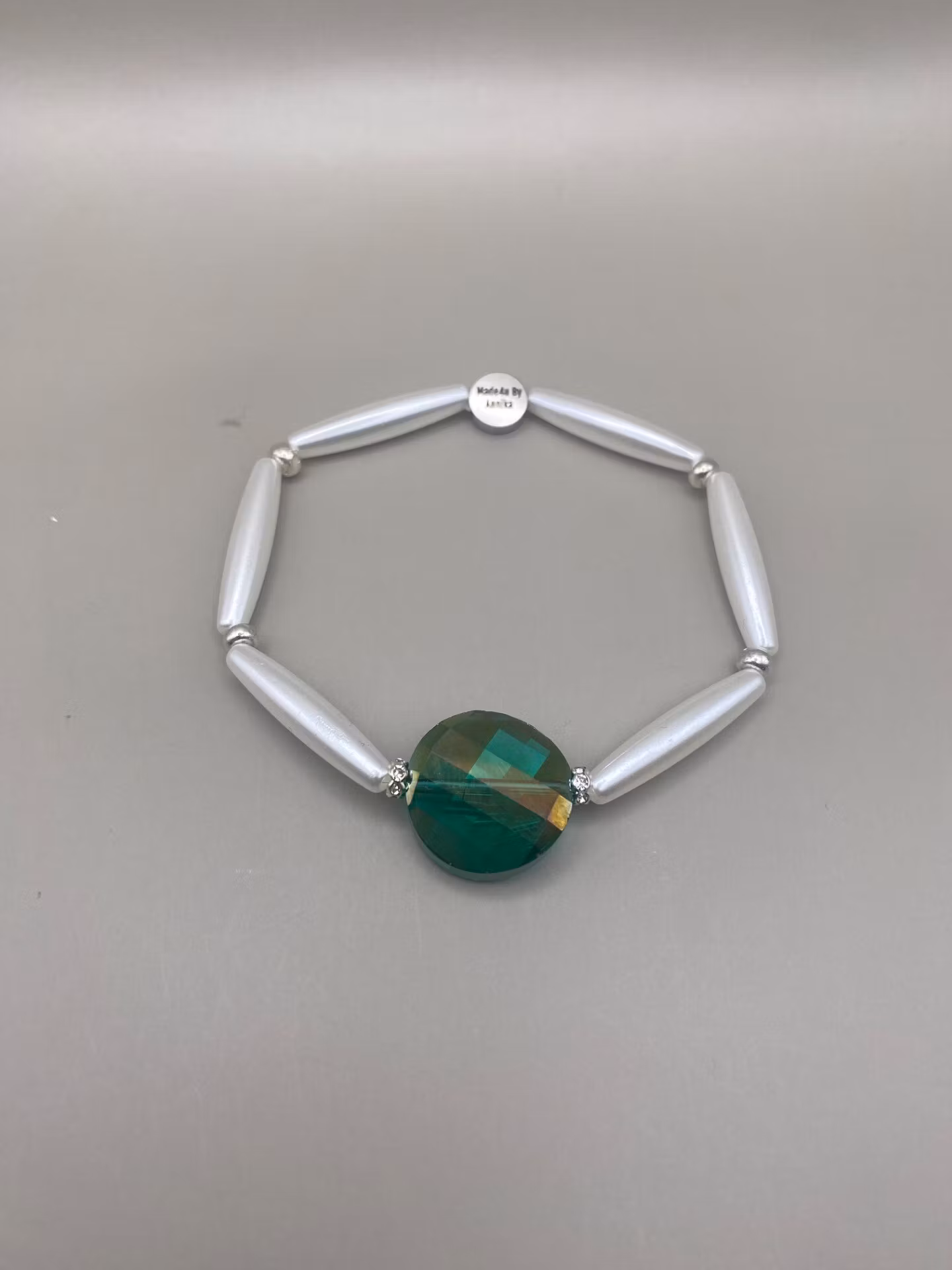 Stiligt armband som sticker ut, avlånga kritvita högblanka pärlor runt om varvat med små silverfärgade glaspärlor, stor facetterad grön glaspärla i blickfånget.