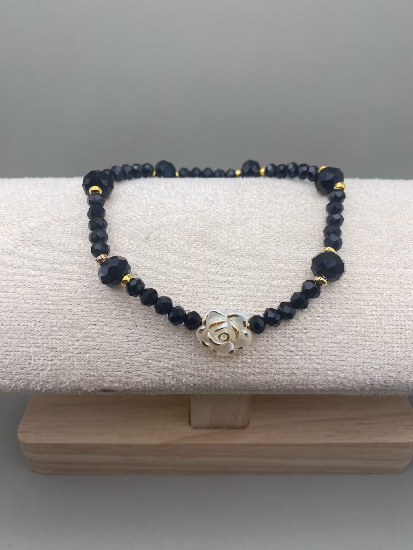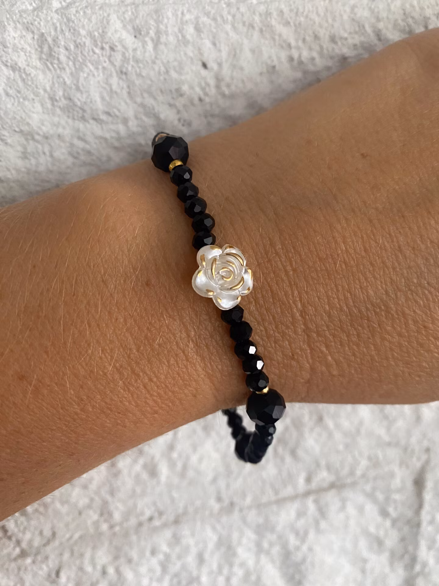 vacker armband i varvat små och stora nattsvarta facetterade glaskristallpärlor och små guldfärgade pärlor. vacker ros i blickfånget.