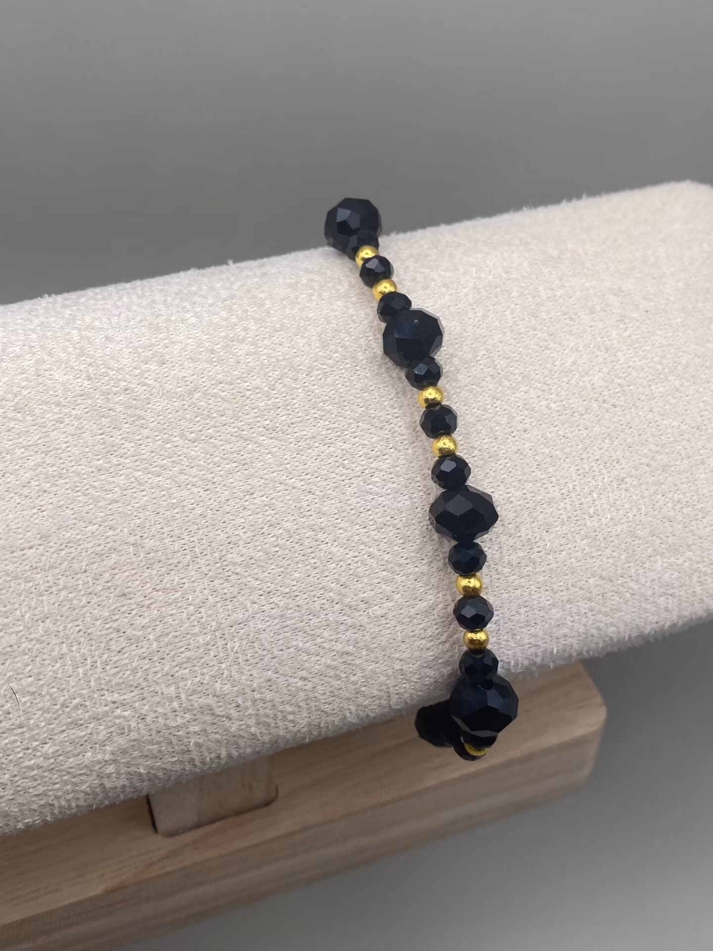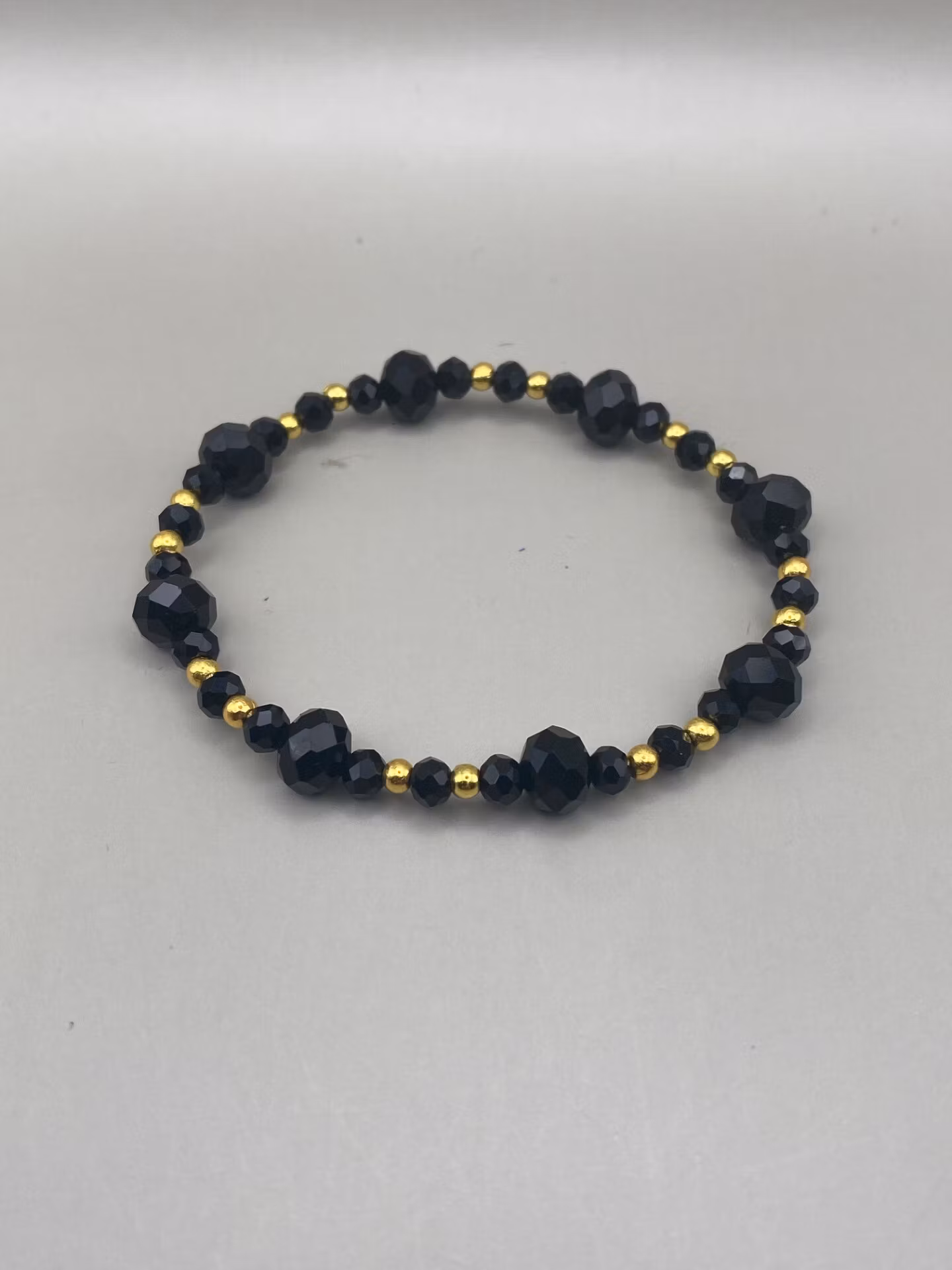 Stiligt armband i vackert mönster av stora och små nattsvarta spegelblanka facetterade glaskristallpärlor varvat med guldfärgade små distanser.