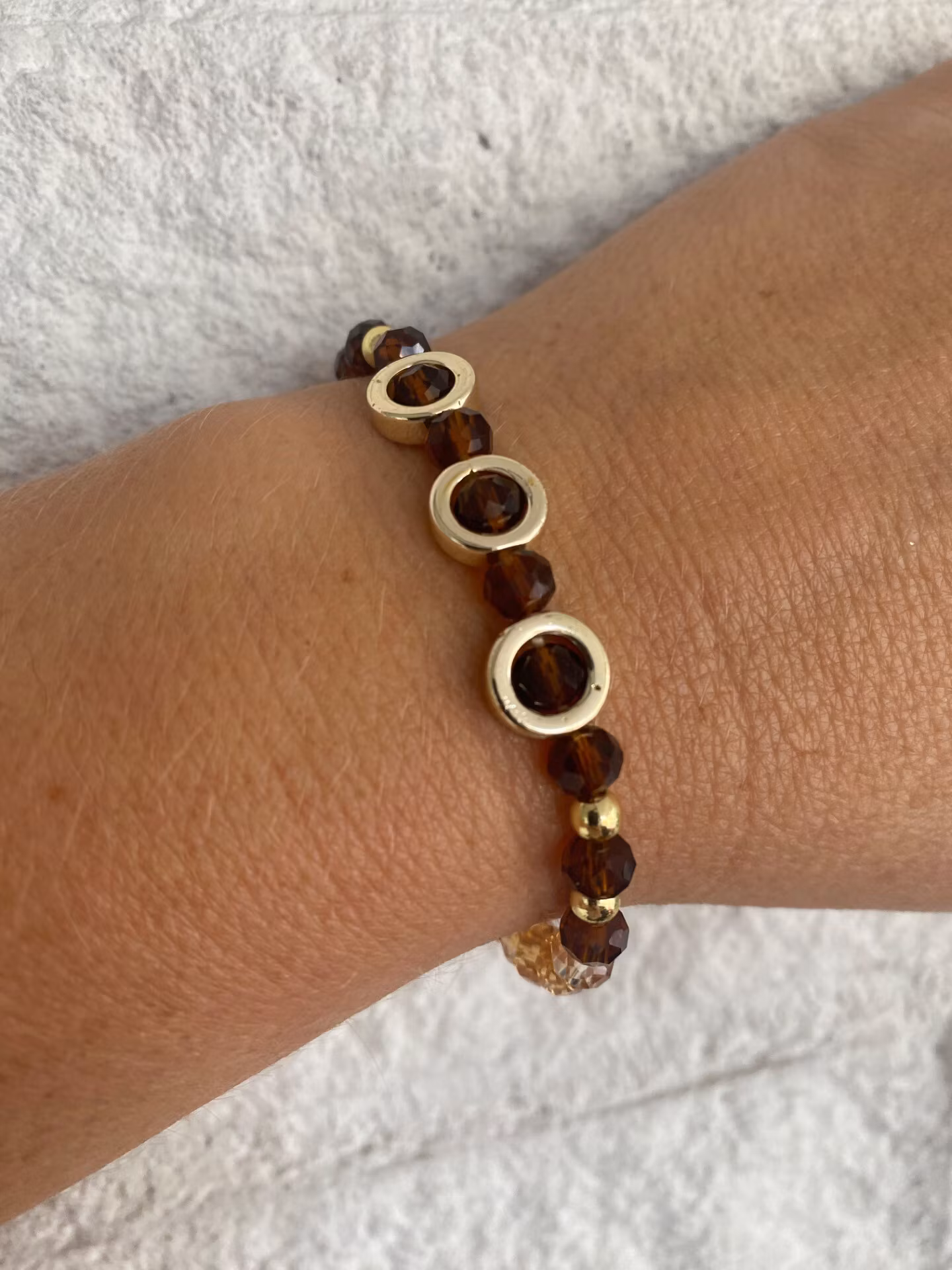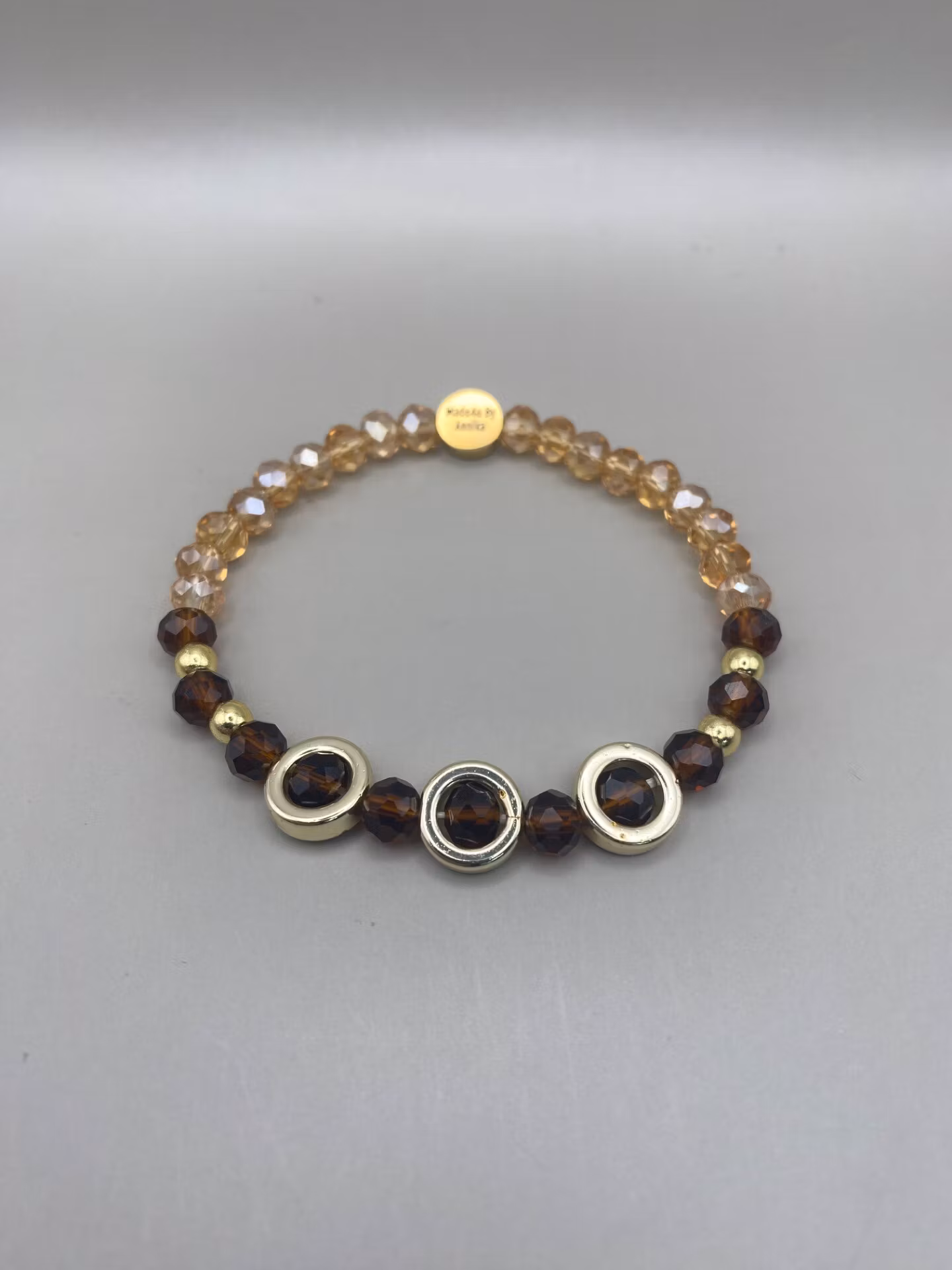 Vackert och elegant armband i varvat mönster av bruna facetterade glaskristallpärlor och guldfärgade pärlor samt tre runda dekorationspärlor i 18K guldpläterad