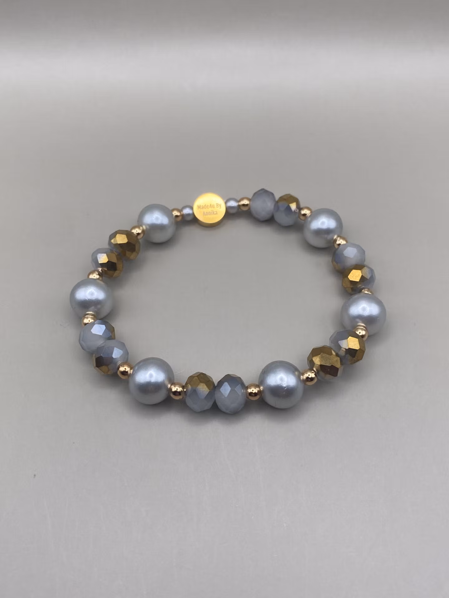 Vackert och skimrande armband i varvat fint mönster av grå- och guldmellerade facetterade glaskristallpärlor och ljus silvergrå stora pärlor och små guldfärgade pärlor.