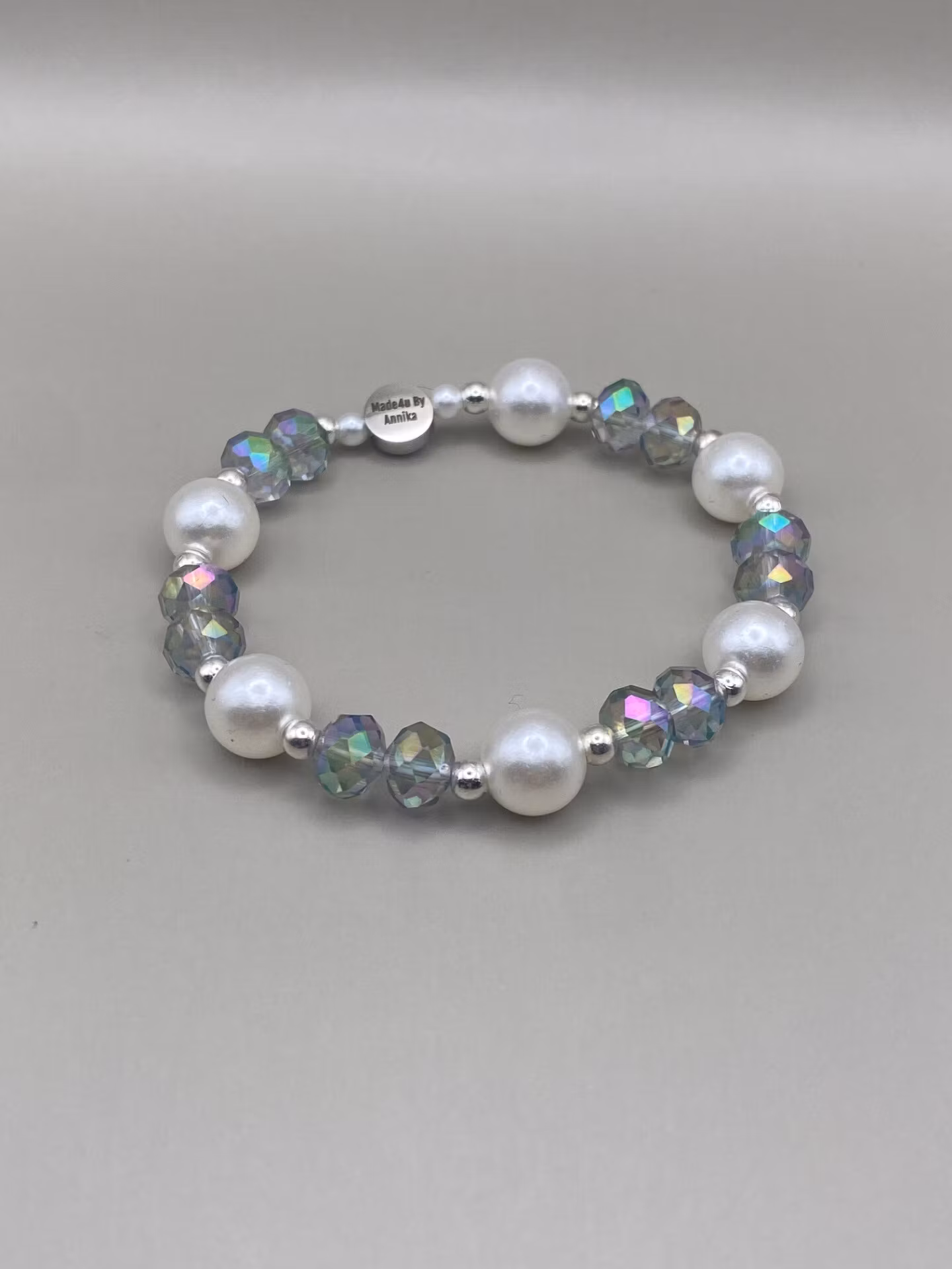 Vackert och skimrande armband i varvat fint mönster av klara gråskimrande facetterade glaskristallpärlor och kritvita högblanka stora pärlor varvat med små silverfärgade pärlor.