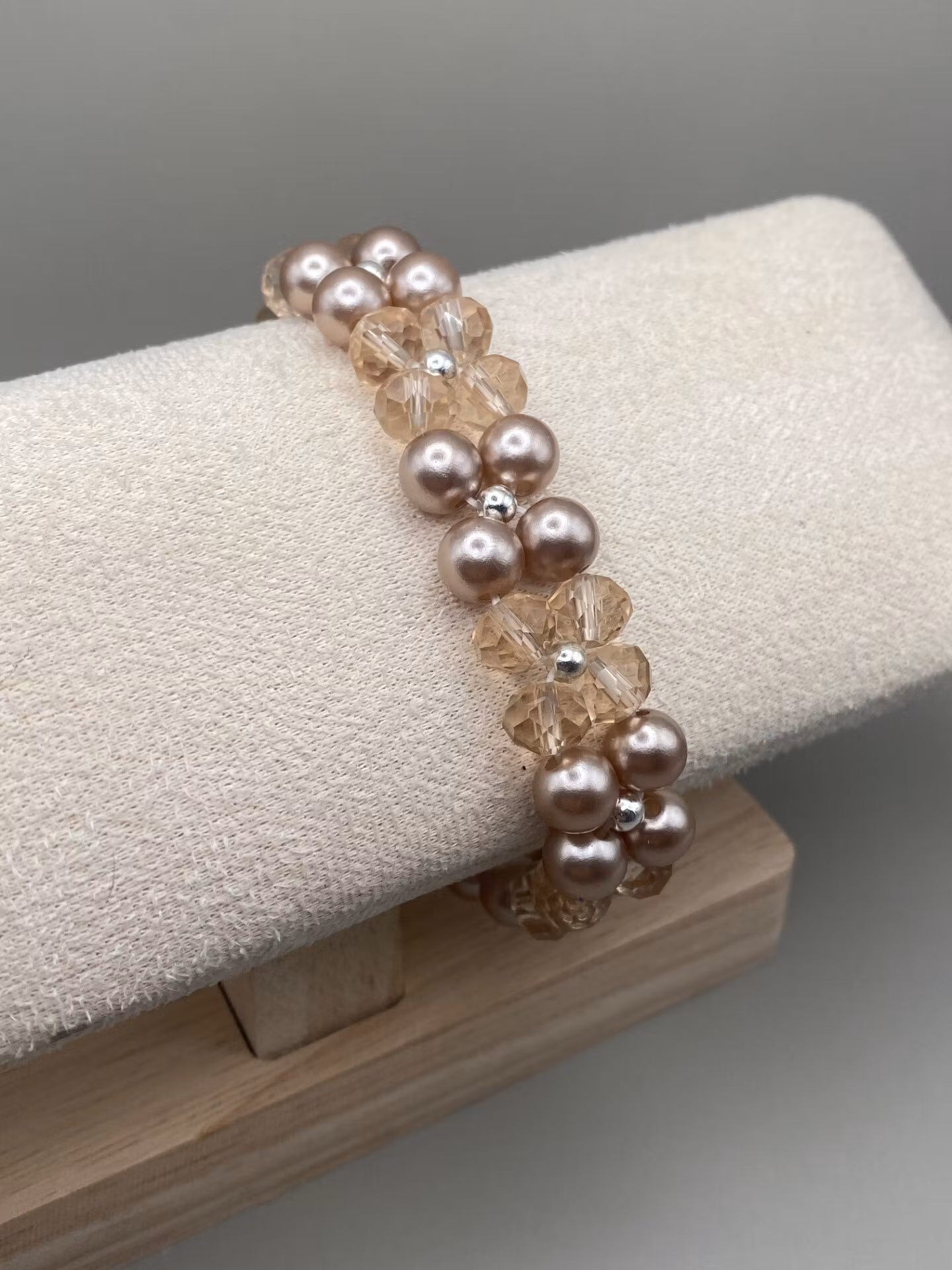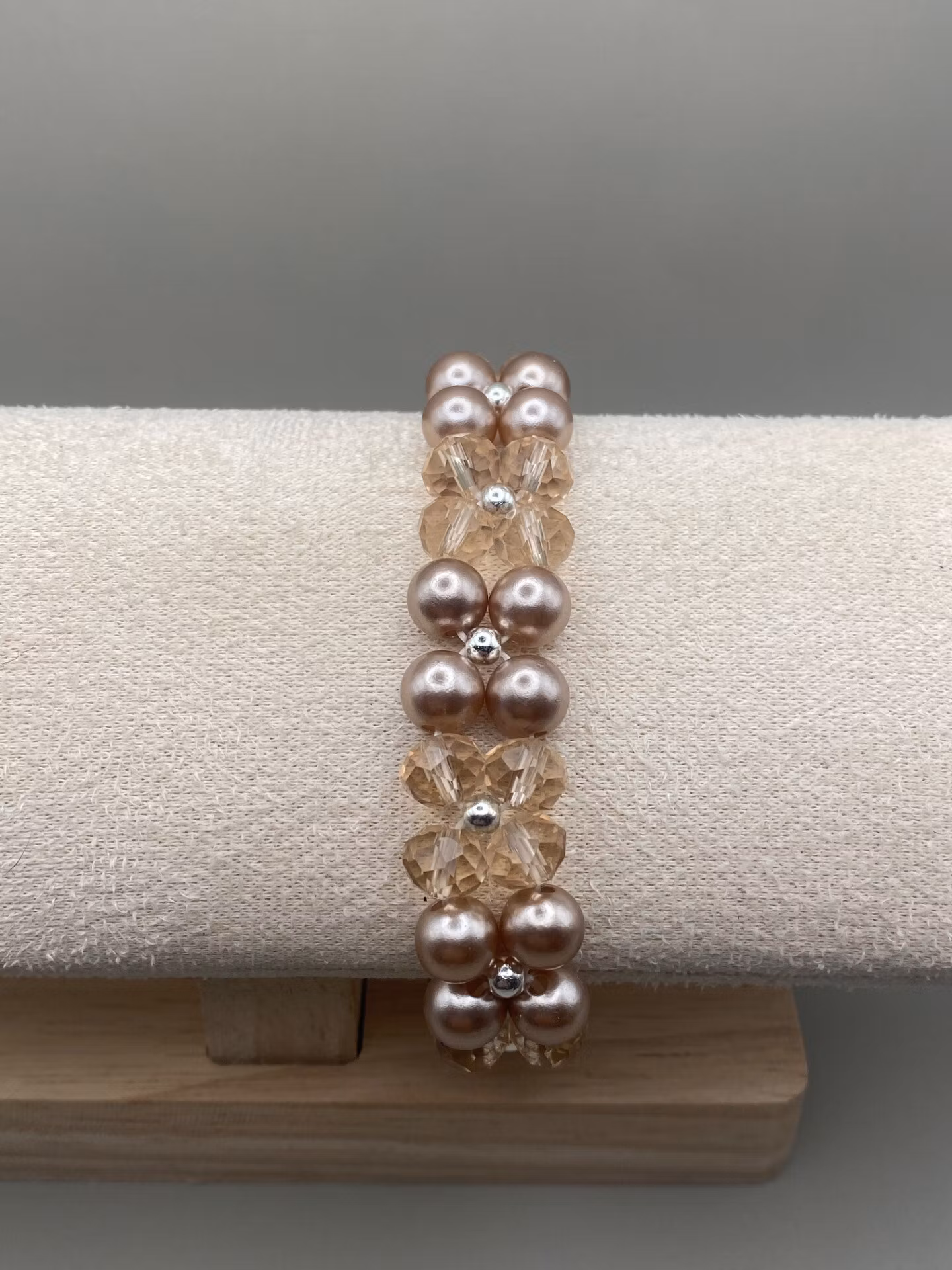 Vackert, brett tvåradigt och skimrande armband i varvat fint mönster av klara champagnefärgade skimrande facetterade glaskristallpärlor och beiga högblanka pärlor varvat med små silverfärgade pärlor.