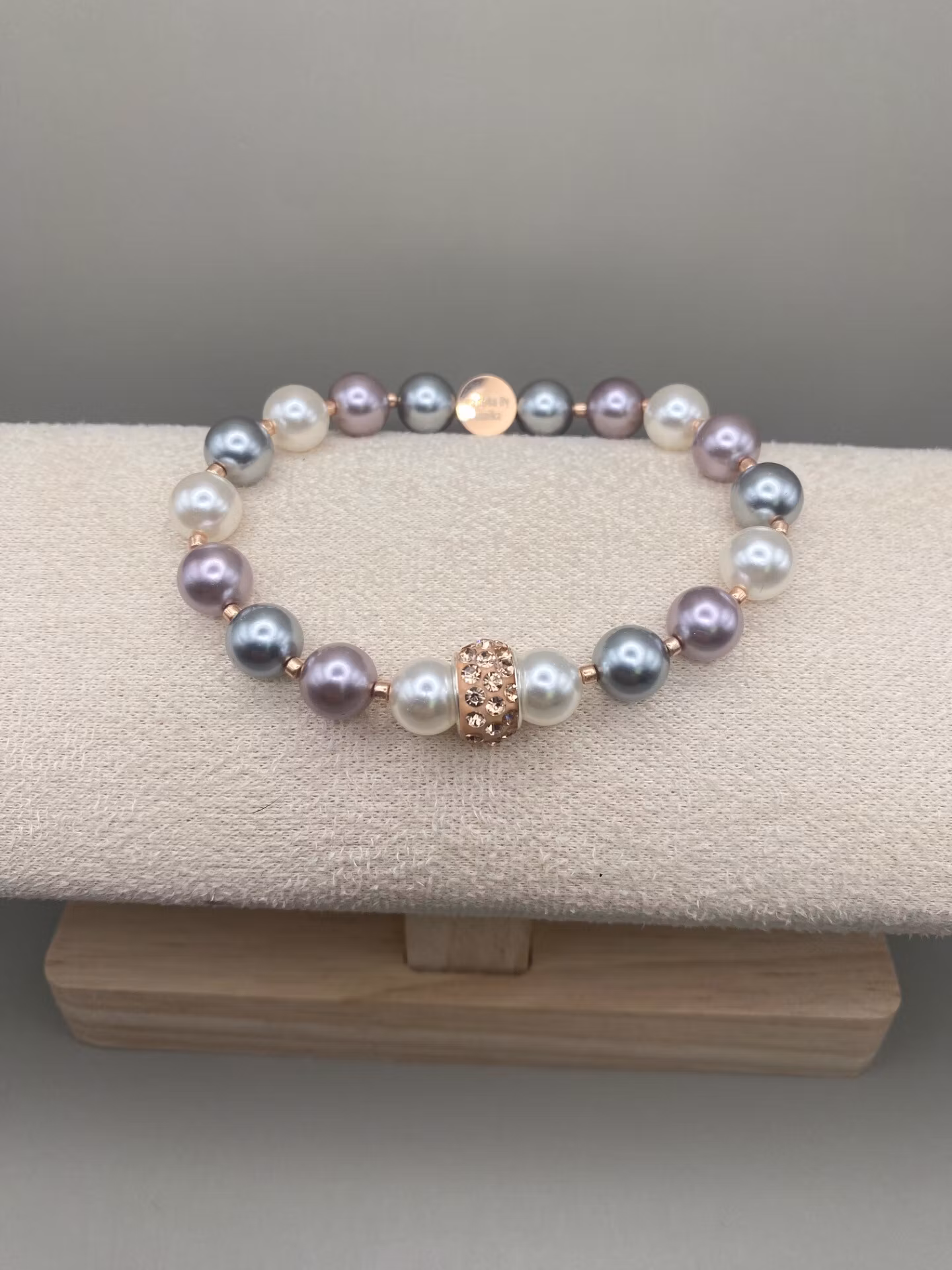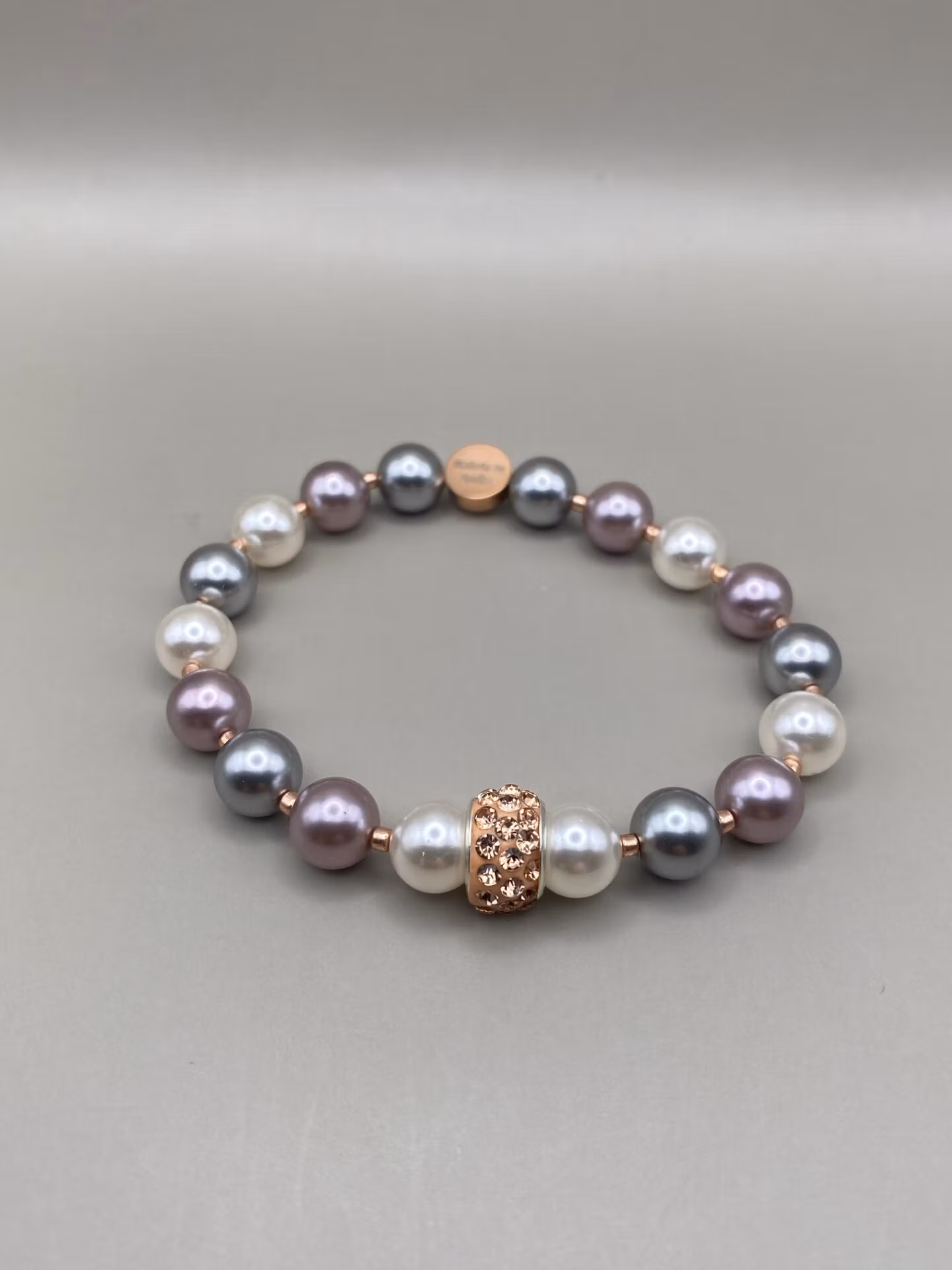 Vackert och sött armband med en härlig sammansättning av vita, grå och ljunglila vaxade glaspärlor, små roséfärgade glaspärlor och strass i blickfånget. Sött och stilrent.