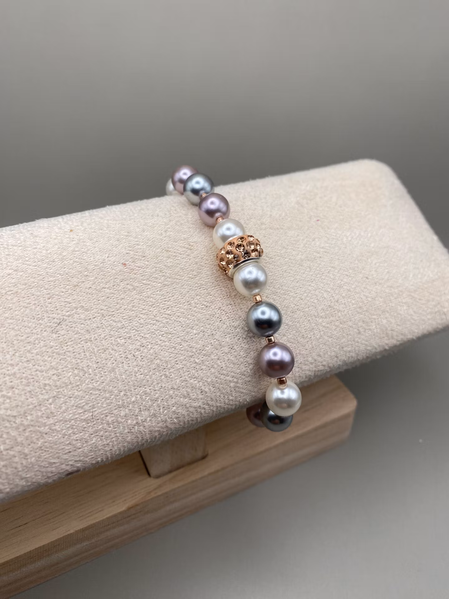 Vackert och sött armband med en härlig sammansättning av vita, grå och ljunglila vaxade glaspärlor, små roséfärgade glaspärlor och strass i blickfånget. Sött oc