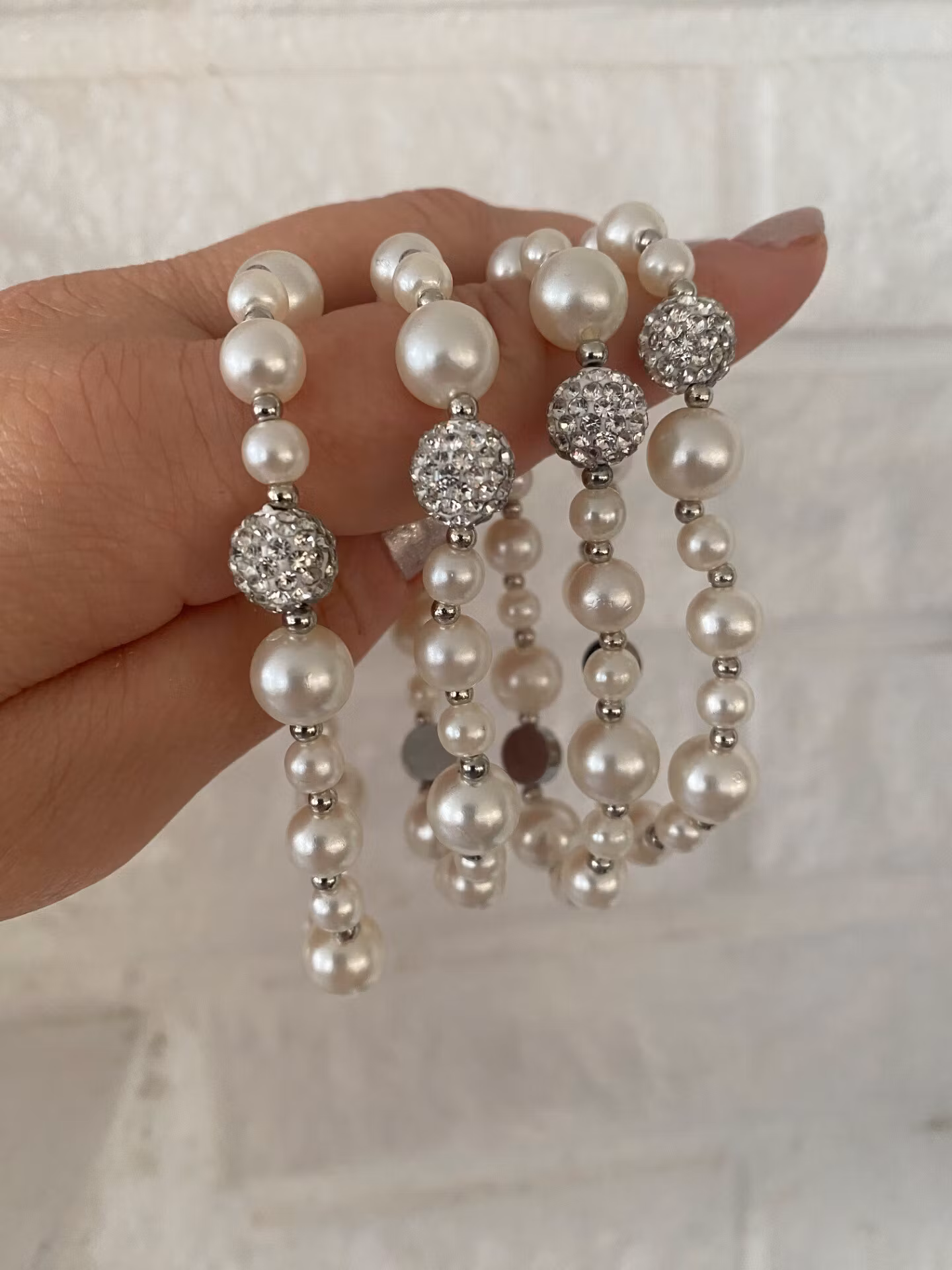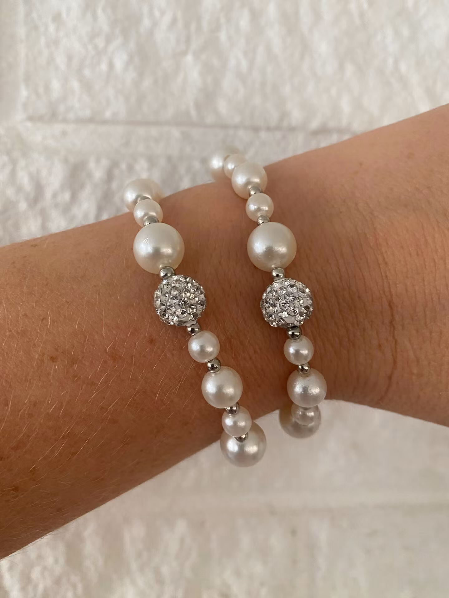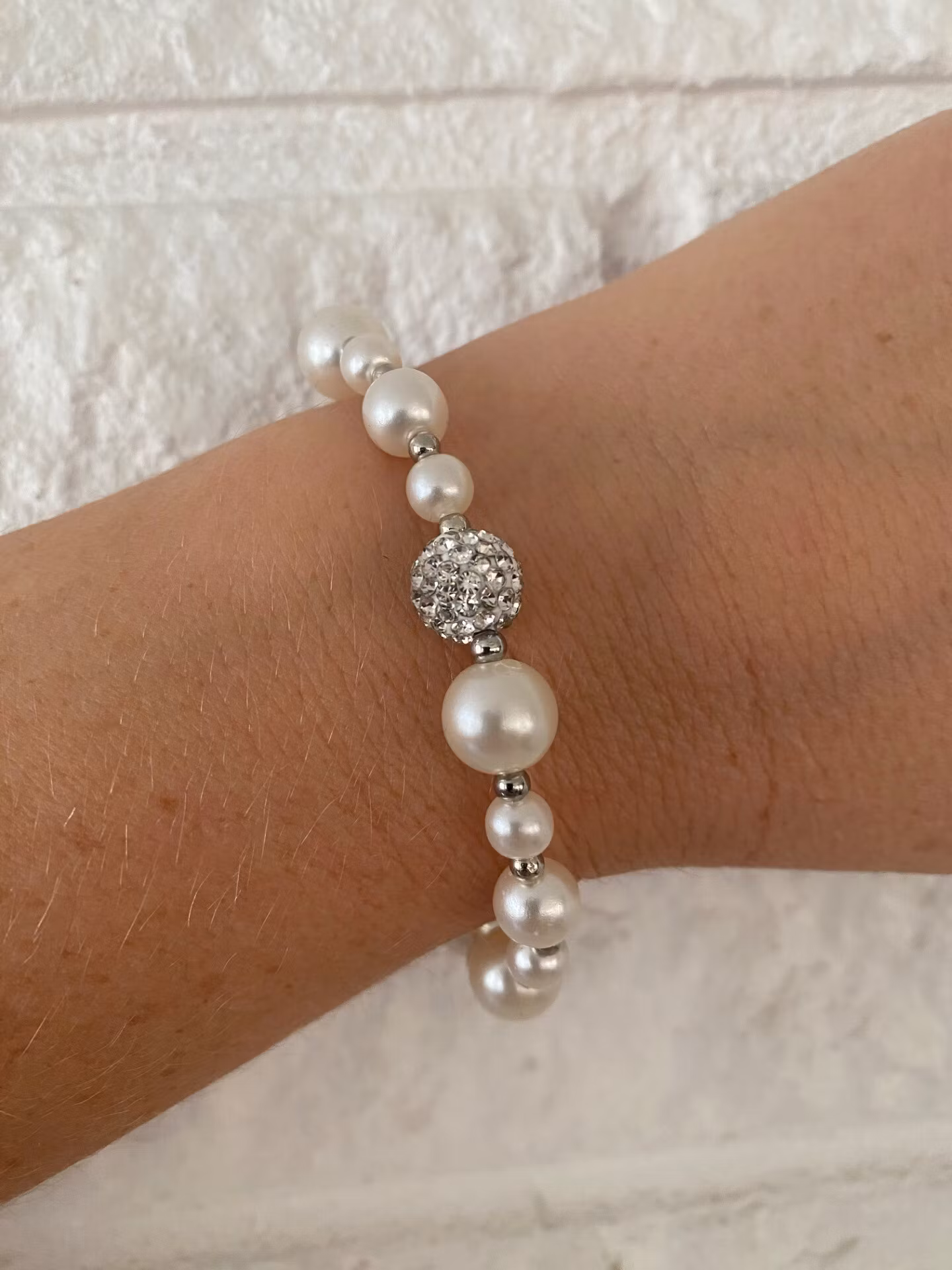 Vackert och lyxigt armband i benvita pärlor i olika storlekar varvat med små silverfärgade pärlor och vacker silverfärgad pärla med rhinestones i blickfångetPas
