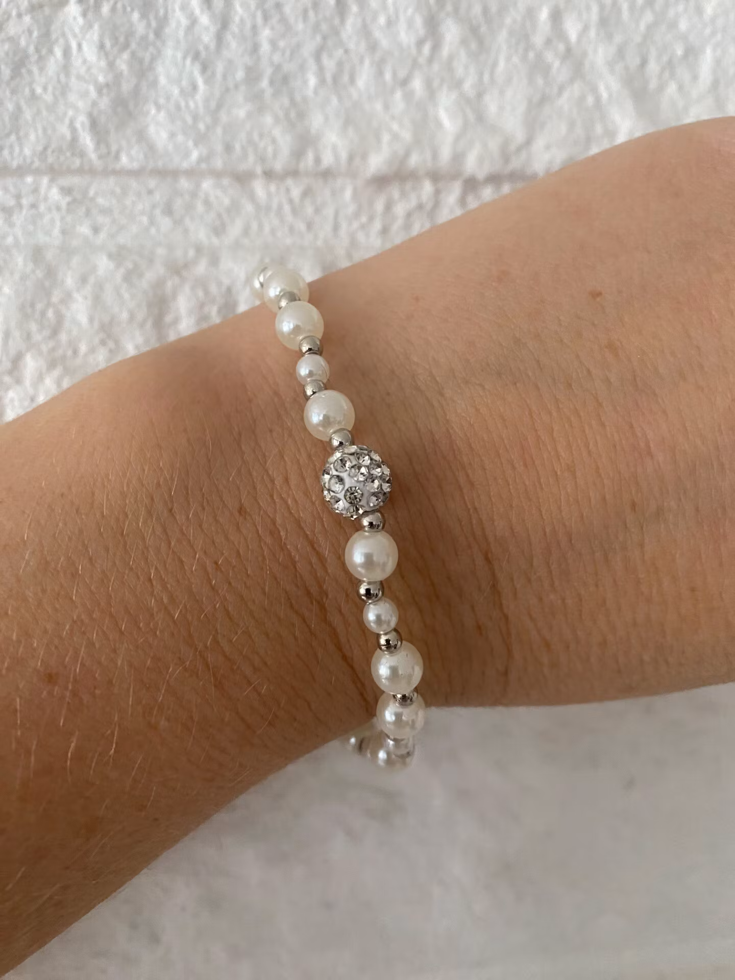 Vackert och lyxigt armband i benvita pärlor i olika mindre storlekar varvat med små silverfärgade pärlor och vacker silverfärgad pärla med rhinestones i blickfå