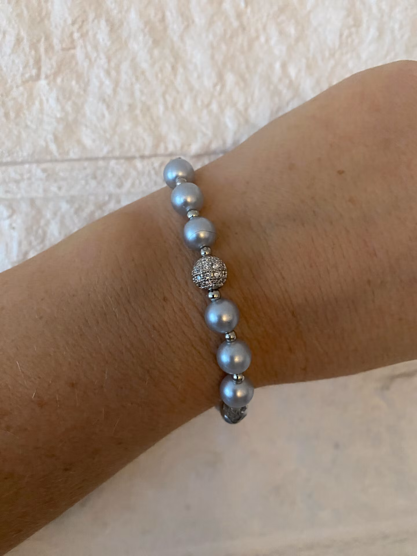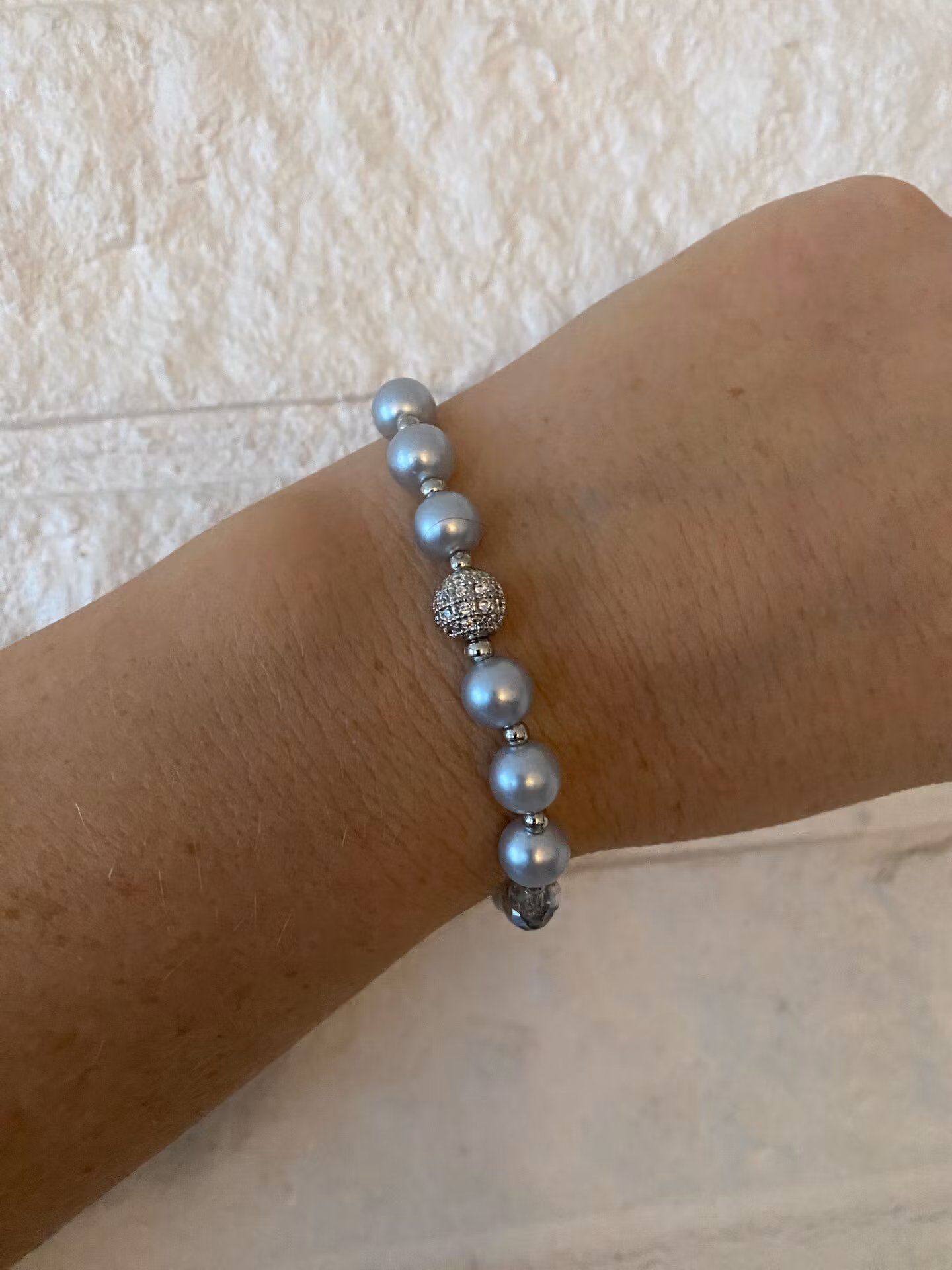 Stilrent och lyxigt armband i ljust silvergrå pärlor i olika mindre storlekar och facetterade silvergrå glaskristallpärlor varvat med så små silverfärgade pärlor och en vacker silverfärgad rund pärla med rhinestones i blickfånget.