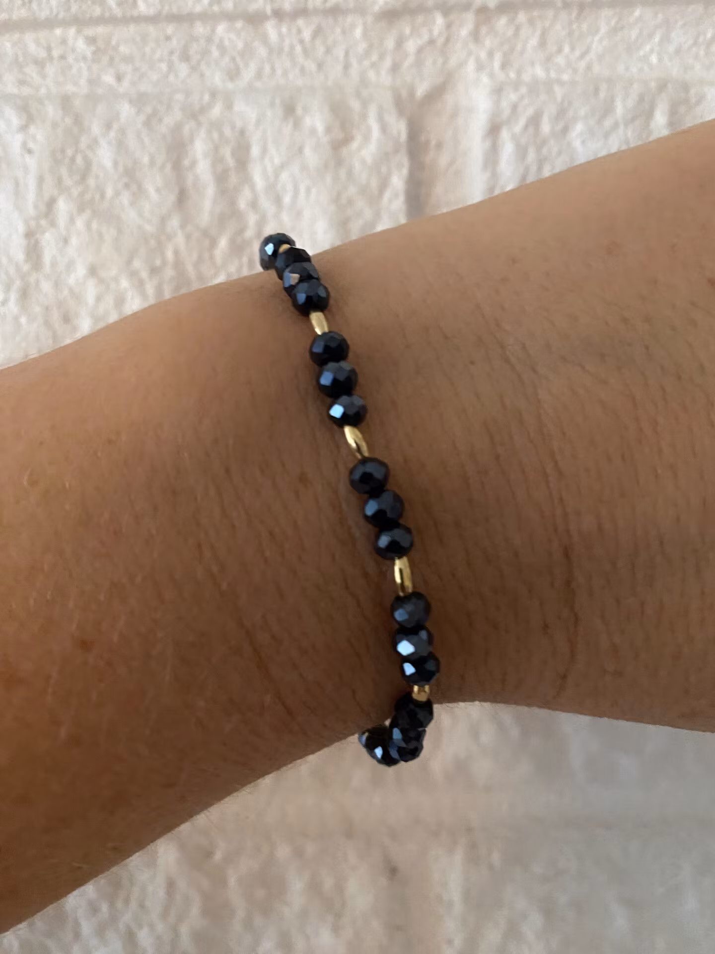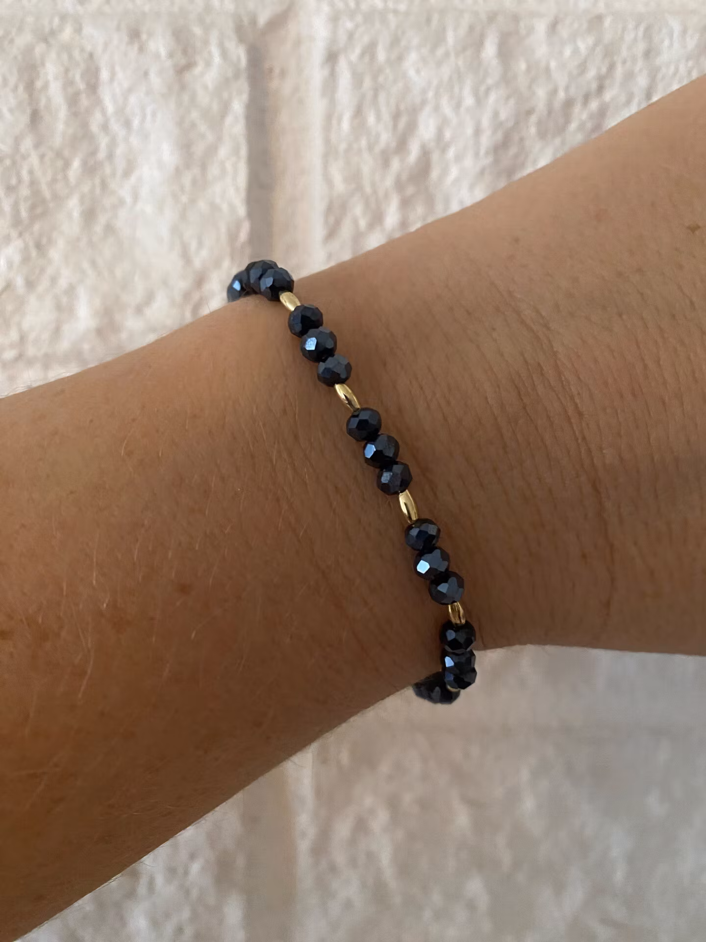 Vackert och lyxigt armband i små midnattsblå spegelblanka facetterade glaskristallpärlor varvat med guldfärgade små avlånga pärlor.Passar bra i kombination med