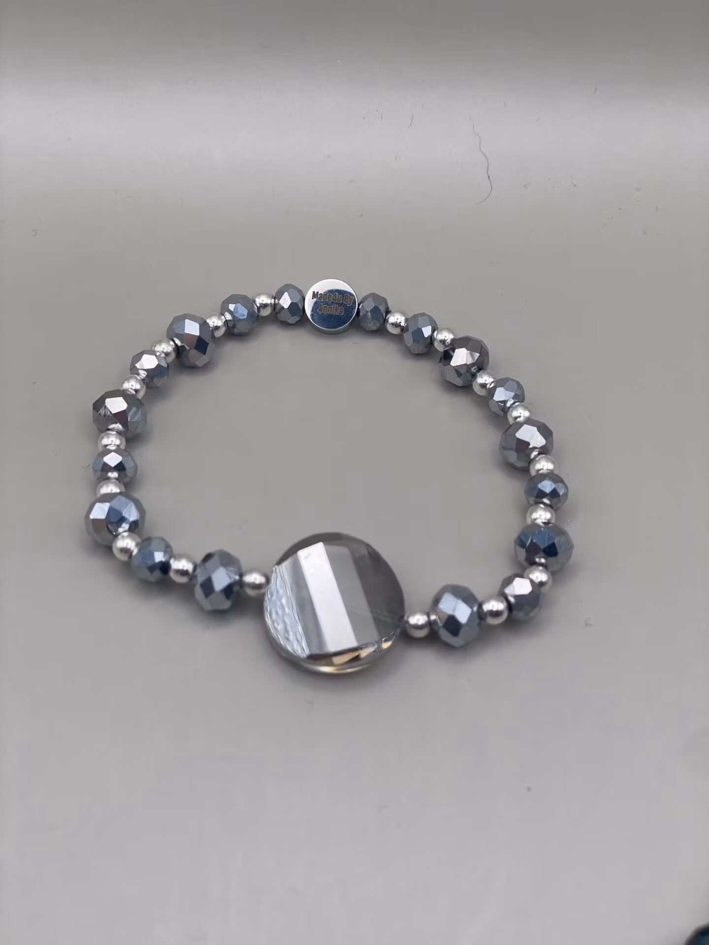 Skimrande lekfullt armband i varvat facetterade högblanka stålgrå glaskristallpärlor i olika storlekar och små guldfärgade distanser. Stor vacker grå glasberlock i blickfånget och avslutas min signaturpärla.