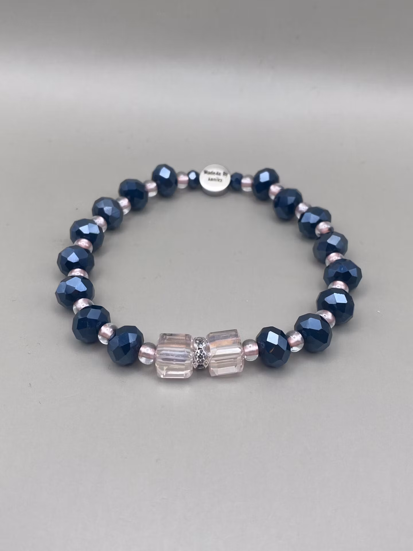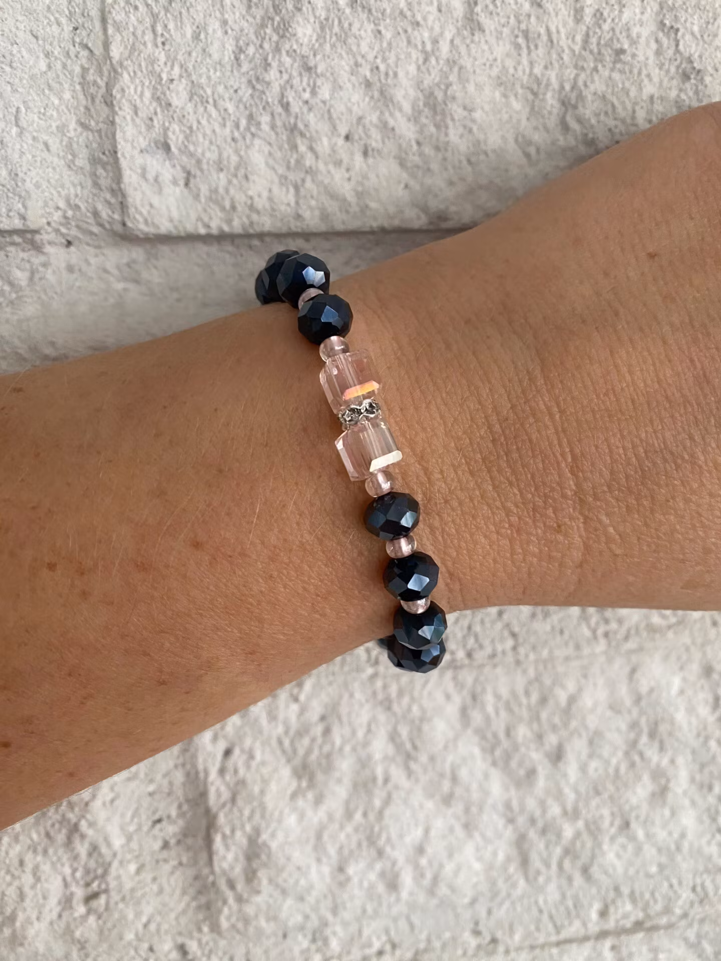 Vackert skimrande armband i varvat högblanka facetterade glaskristallpärlor och små ljusrosa glaspärlor. I blickfånget möts du av två fyrkantiga ljusrosa glaspärlor och en strassdetalj. Avslutas som vanligt med min signaturpärla.