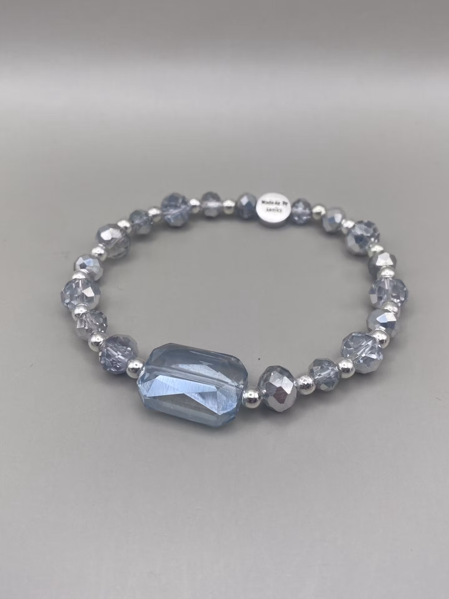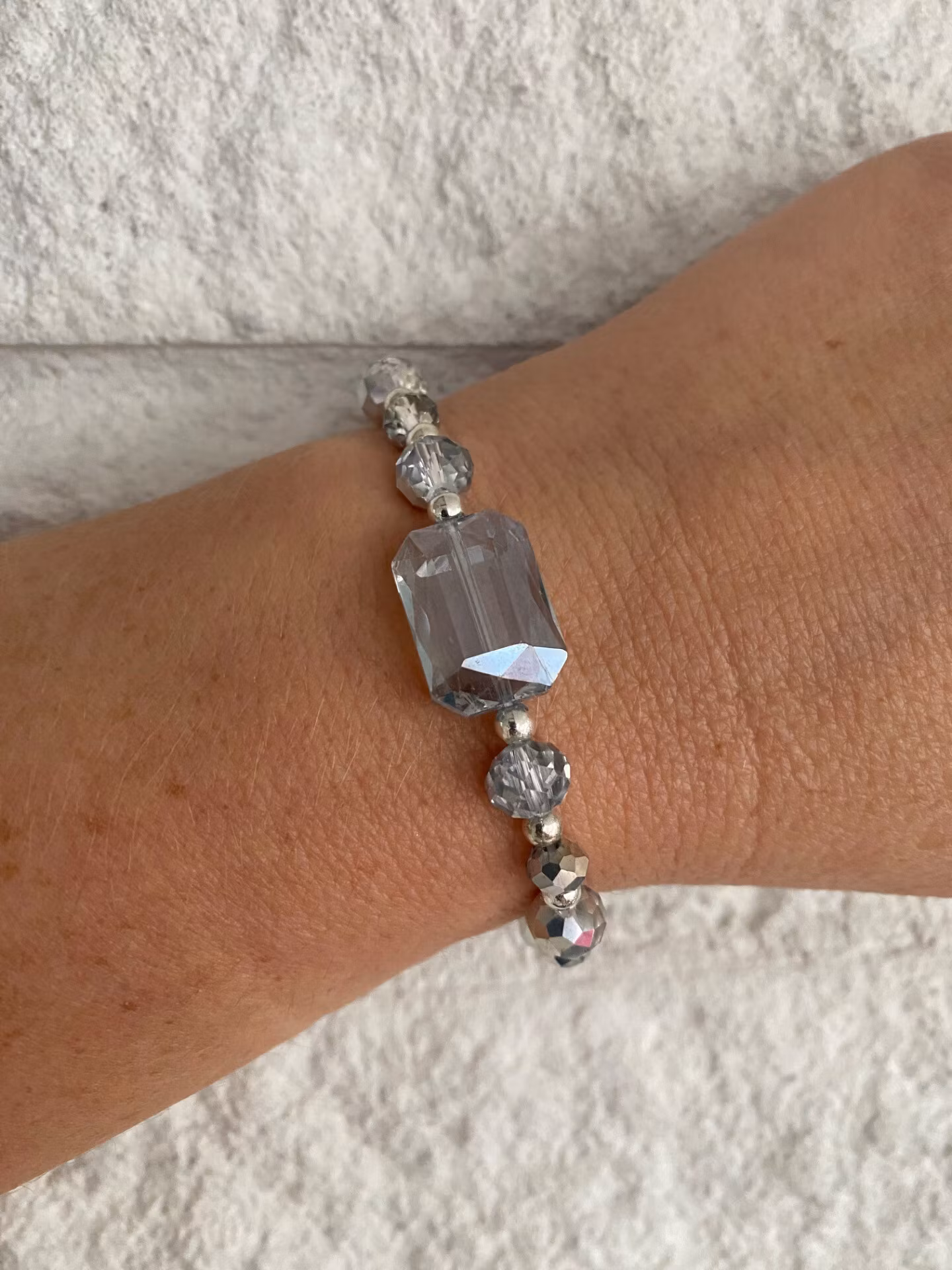 Skimrande lekfullt armband i varvat facetterade högblanka ljust silvergrå glaskristallpärlor i olika storlekar och små silverfärgade distanser. Stor rektangulär vacker ljusgrå glasberlock i blickfånget och avslutas min signaturpärla.