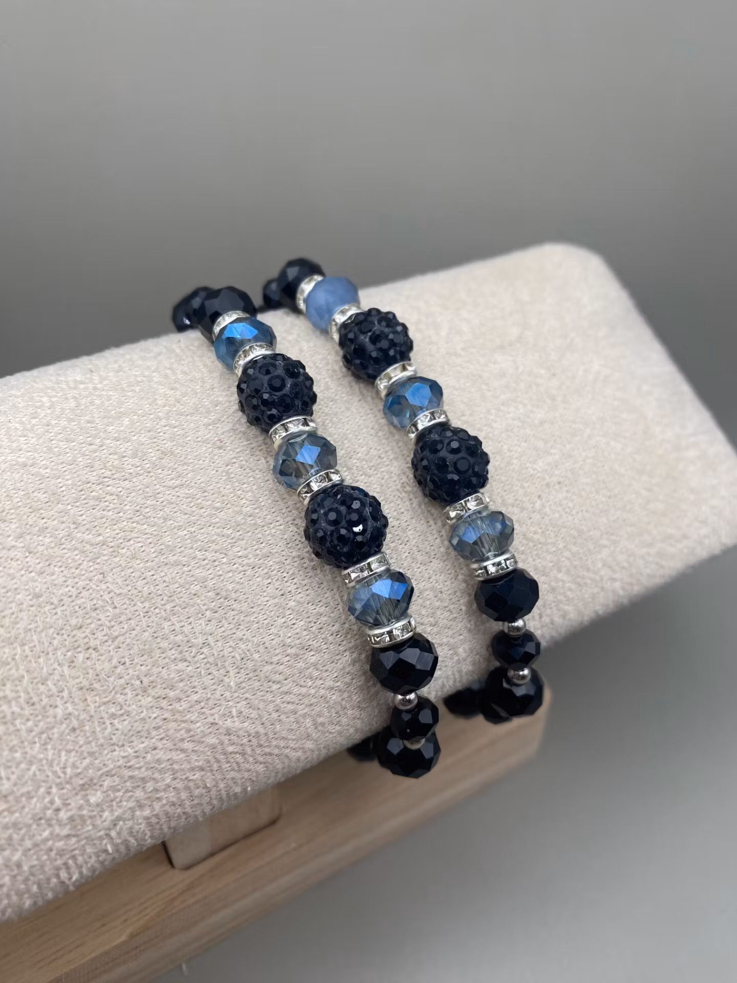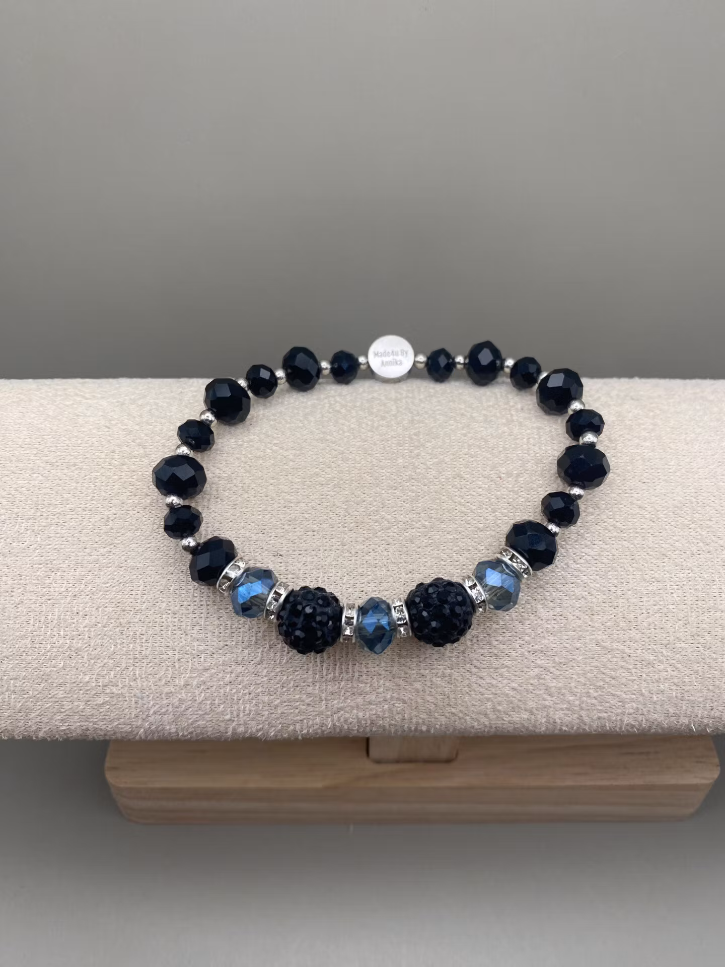 Vackert och lyxigt armband i svarta högblanka facetterade glaskristallpärlor i olika storlekar varvat med små silverfärgade pärlor, silvriga strassdistanser och