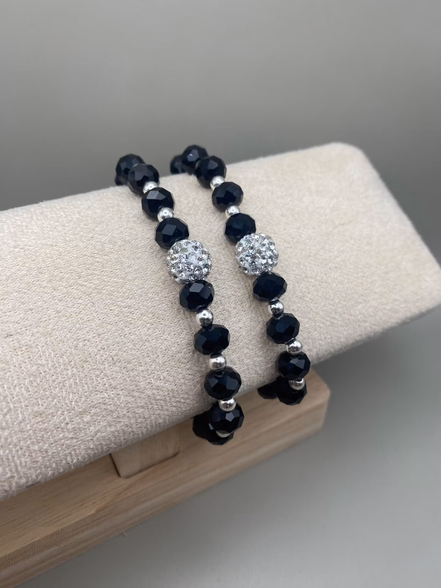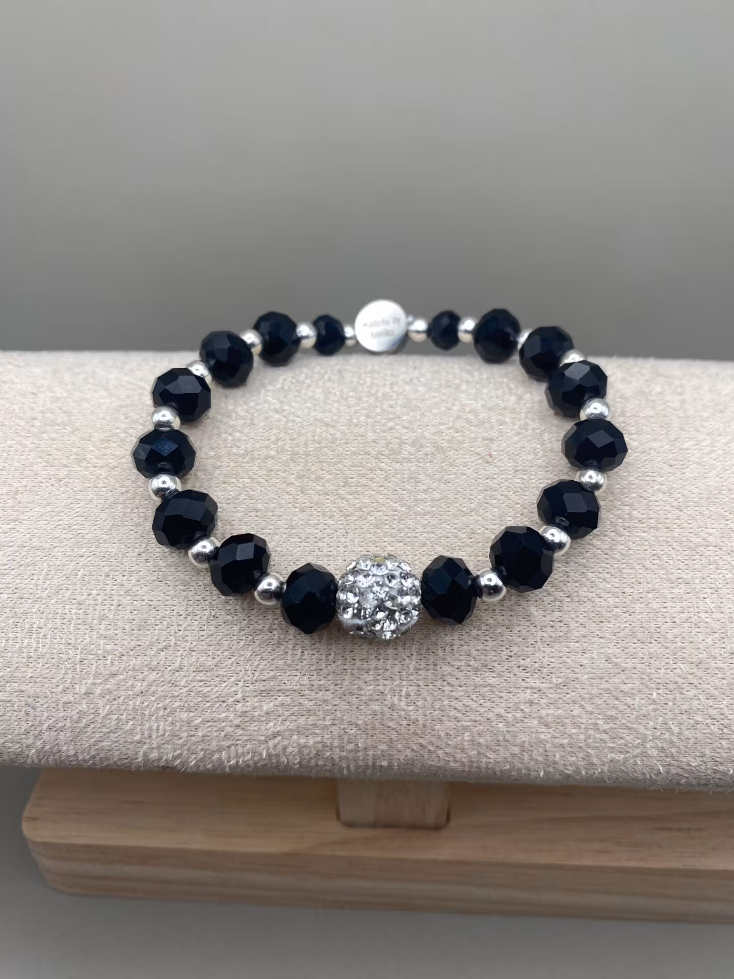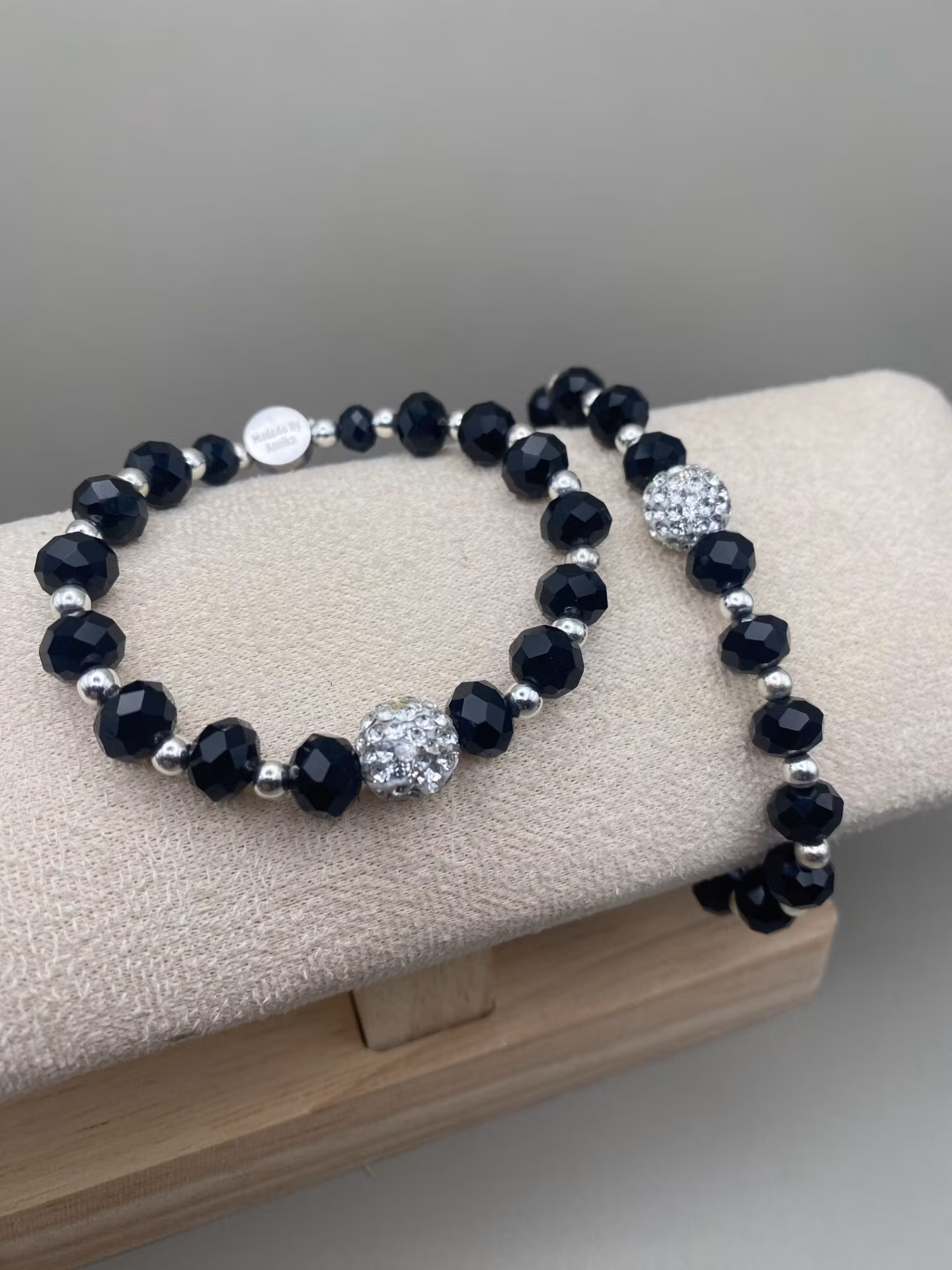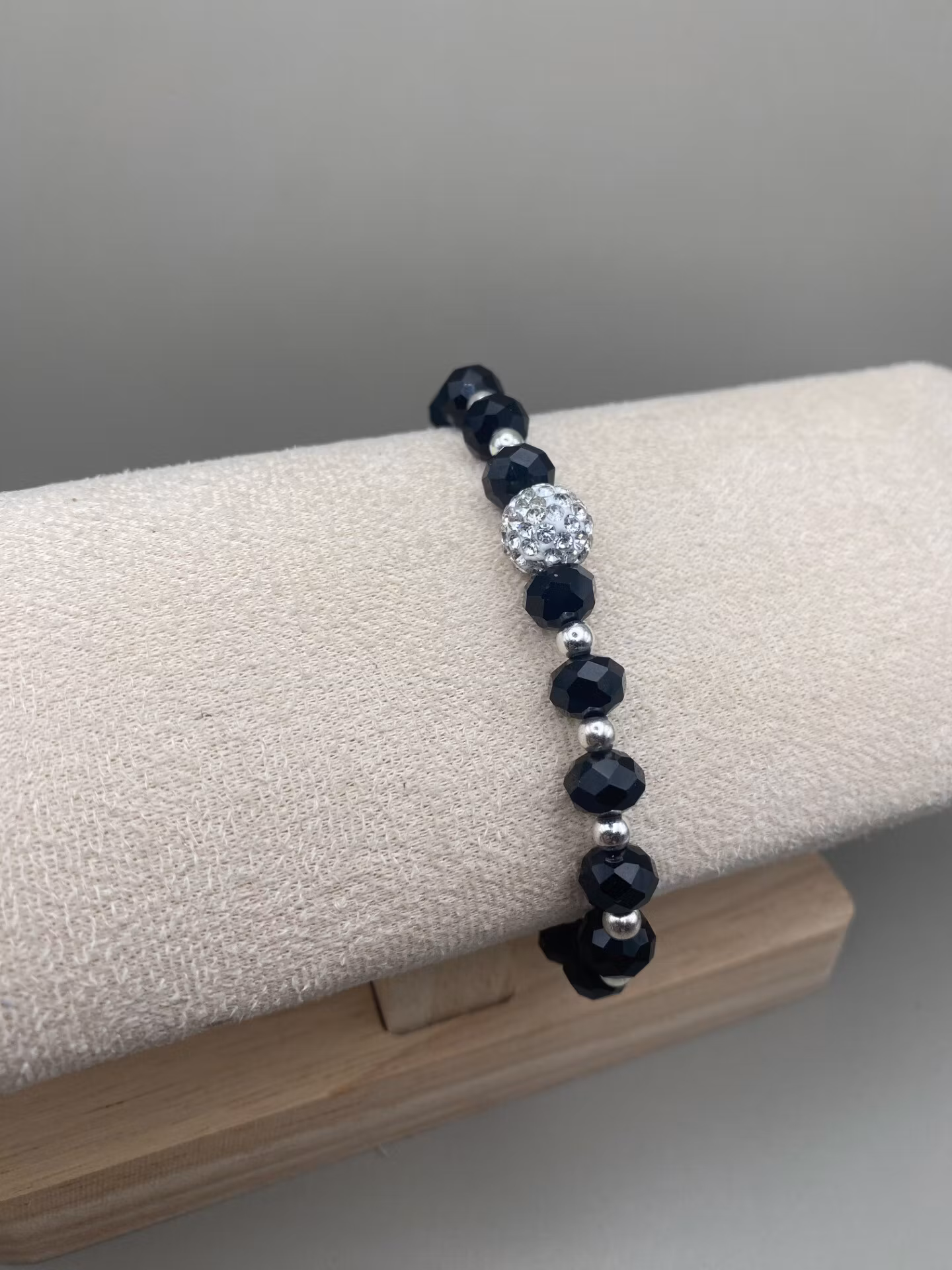 Vackert och lyxigt armband i svarta högblanka facetterade glaskristallpärlor i olika storlekar varvat med små silverfärgade pärlor och vacker silverfärgad pärla med rhinestones i blickfånget