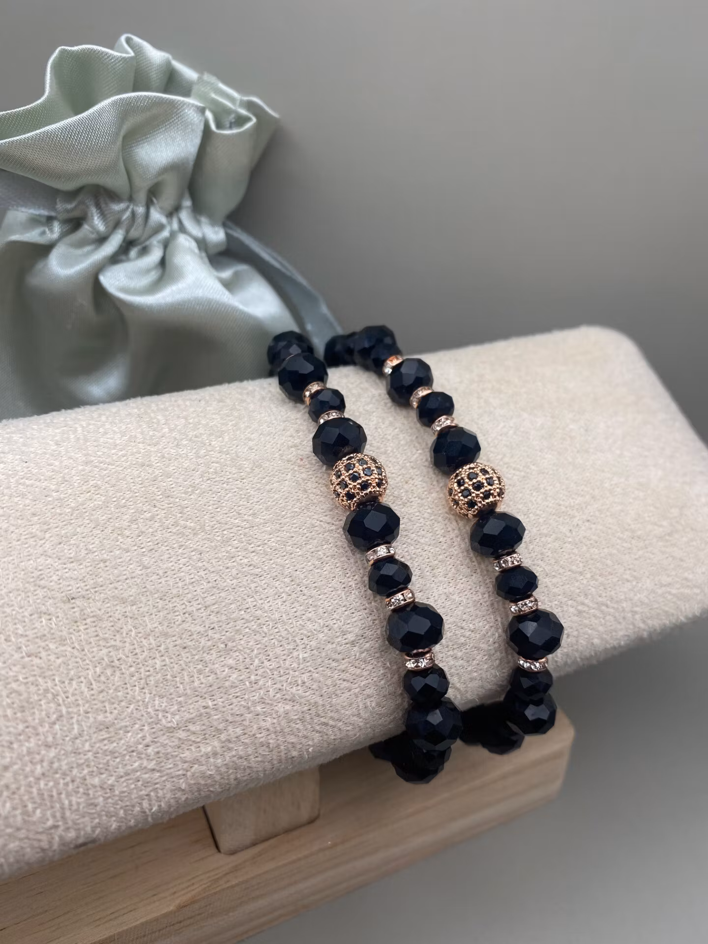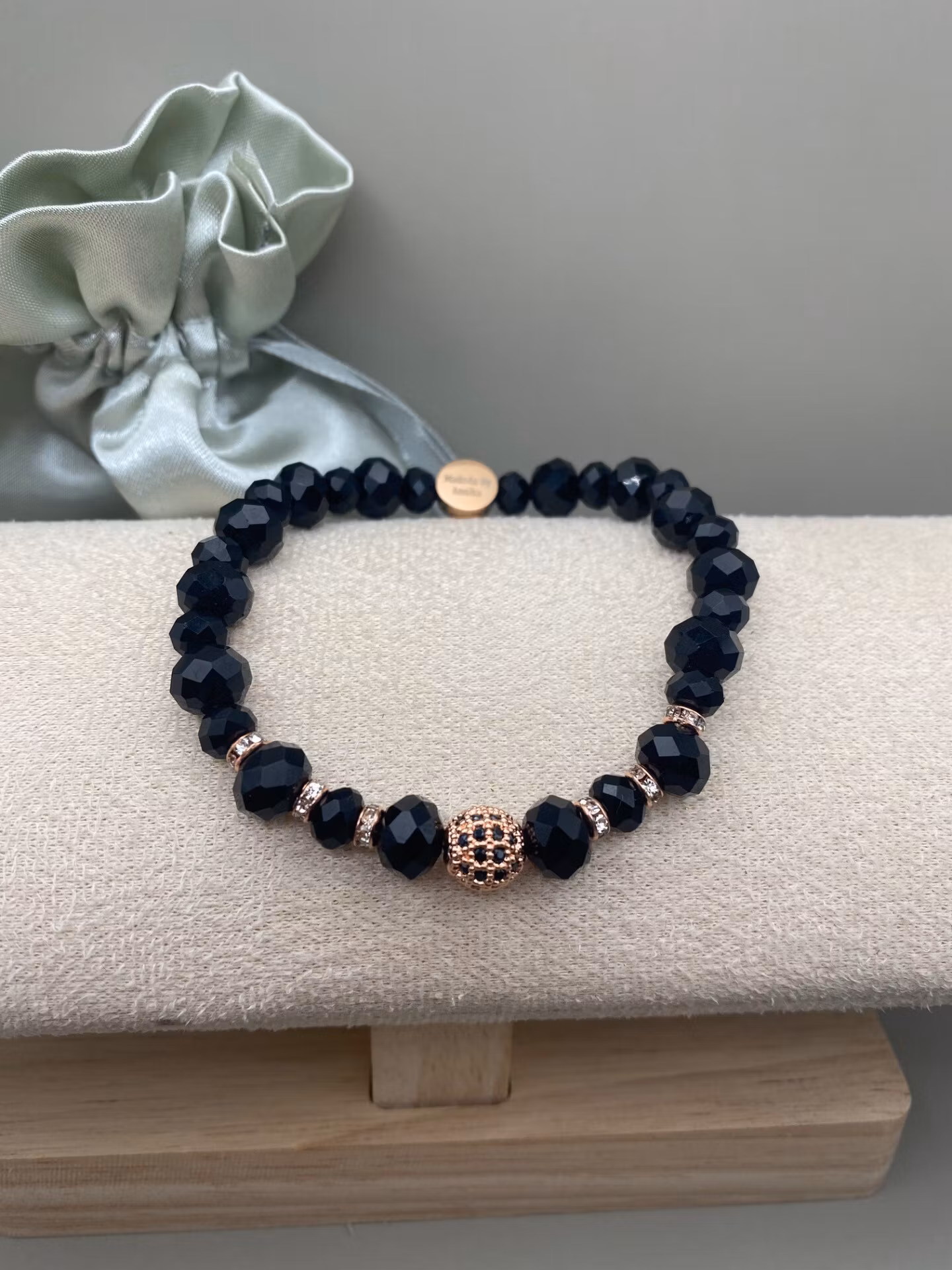 Vackert och lyxigt armband i svarta högblanka facetterade glaskristallpärlor i olika storlekar varvat med små roséfärgad strass och vacker roséfärgad pärla med rhinestones i blickfånget