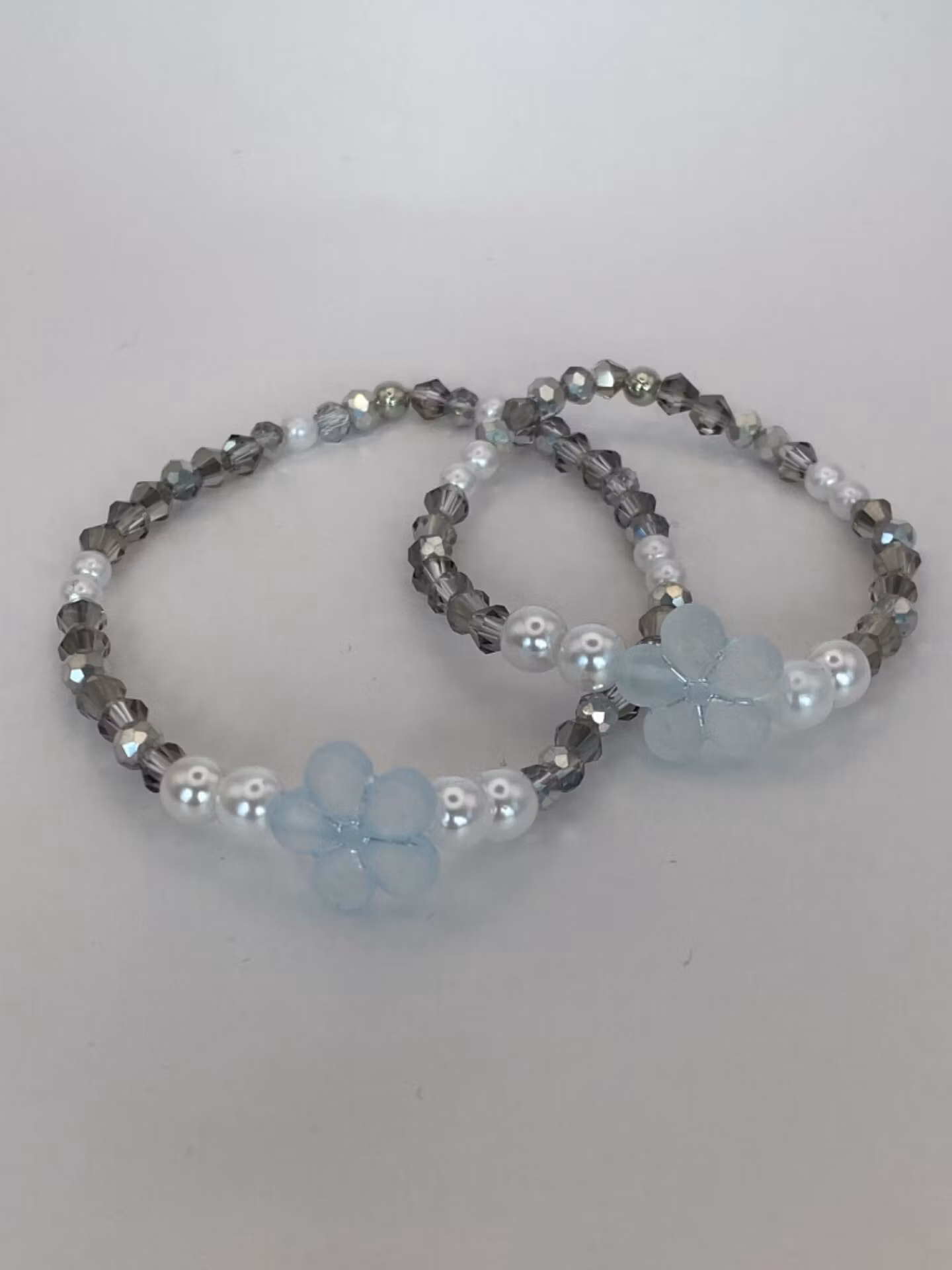 Två likadana armband i silvergrå glaspärlor, varvat med vita små vaxade pärlor och vacker ljusblå blomma i blickfånget. Perfekt att användas tillsammans på kala