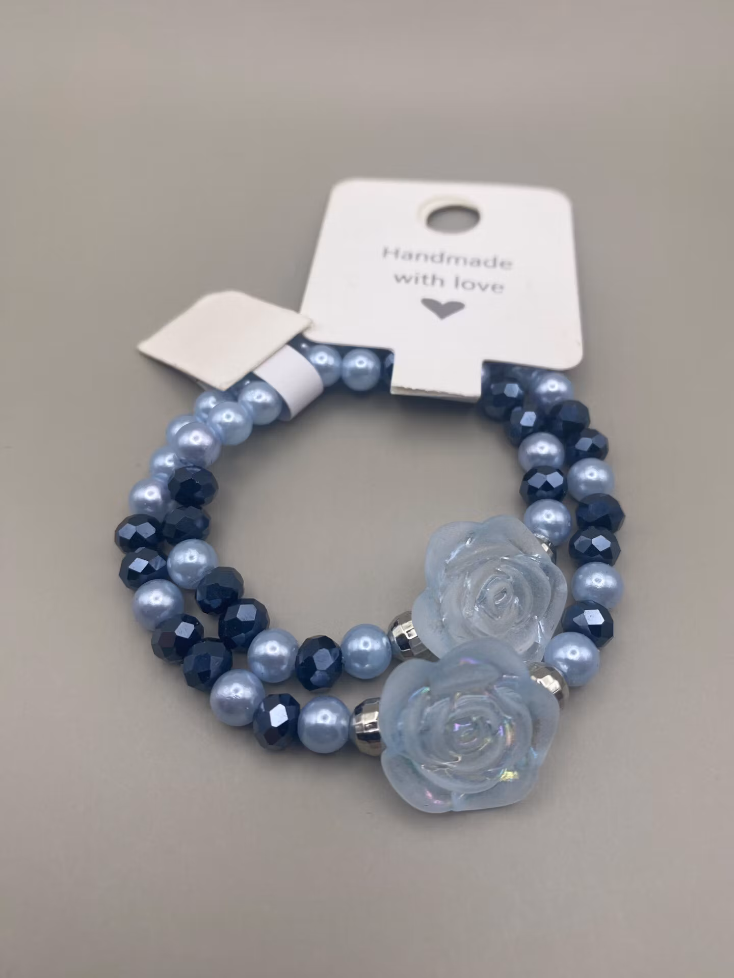 Två likadana armband i ljusblå pärlor varvat med midnattsblå glaspärlor, ”discokulor” och ljusblå vacker ros i blickfånget. Perfekt att användas tillsammans på kalas och festligheter.