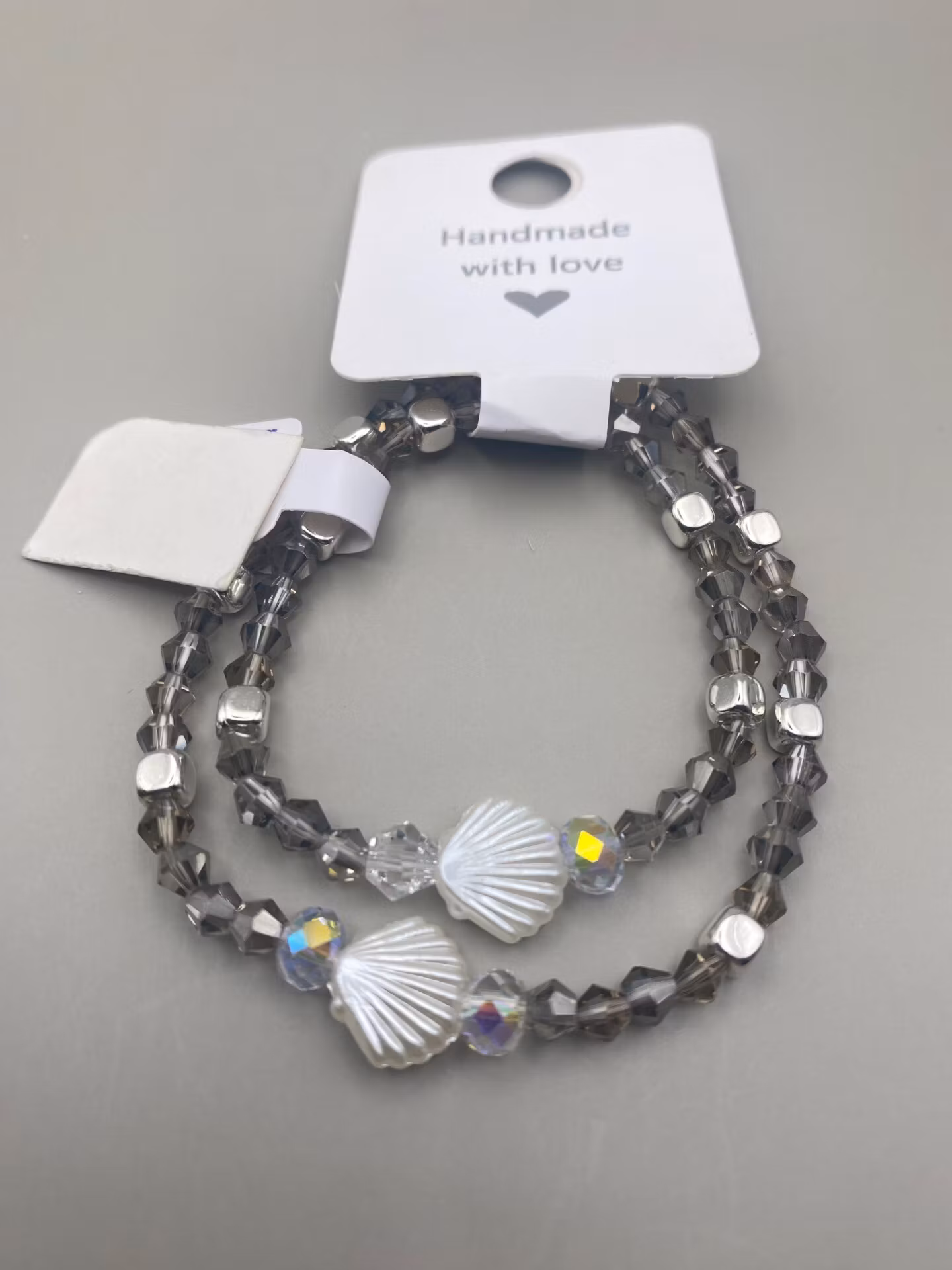 Två likadana armband i silvergrå glaspärlor, varvat med silverfärgade fyrkantiga pärlor, genomskinliga glittrande glaspärlor och vit snäcka i blickfånget. Perfe