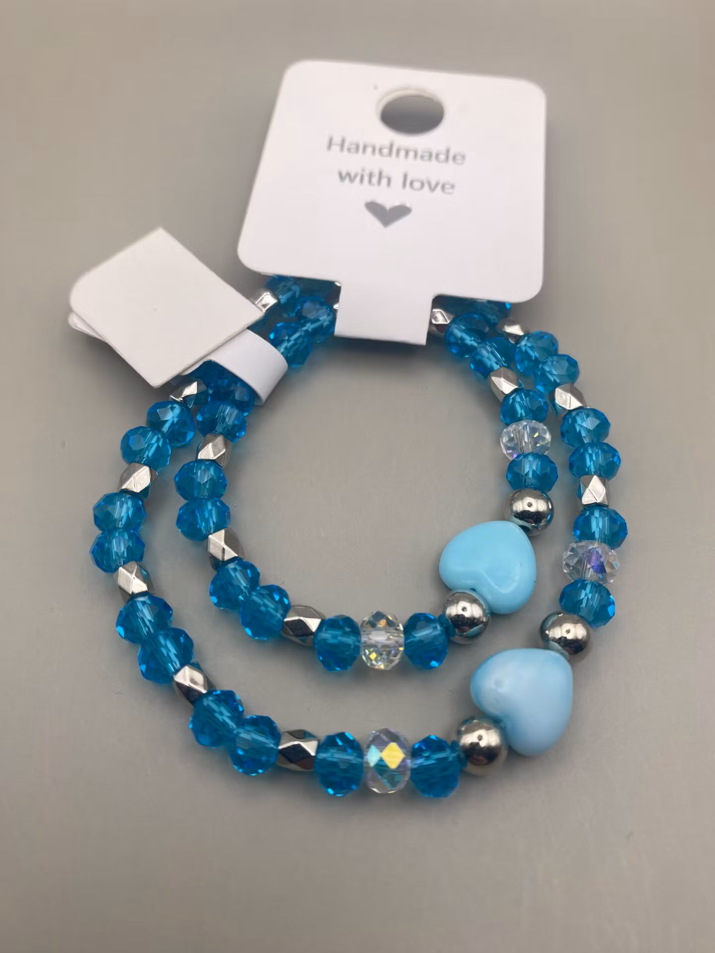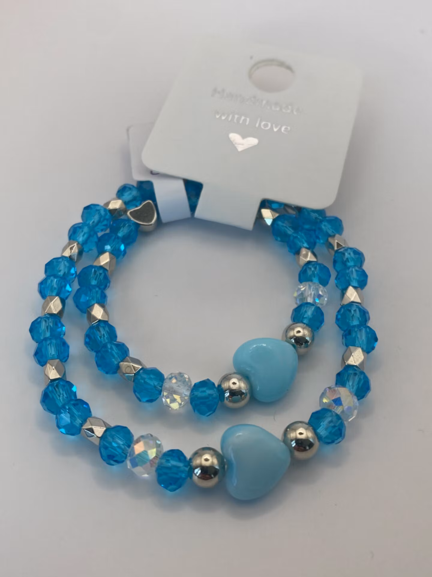 Två likadana armband i turkosa glaspärlor, varvat med silverfärgade pärlor, genomskinliga glittrande glaspärlor och ljusblå/turkost hjärta i blickfånget.