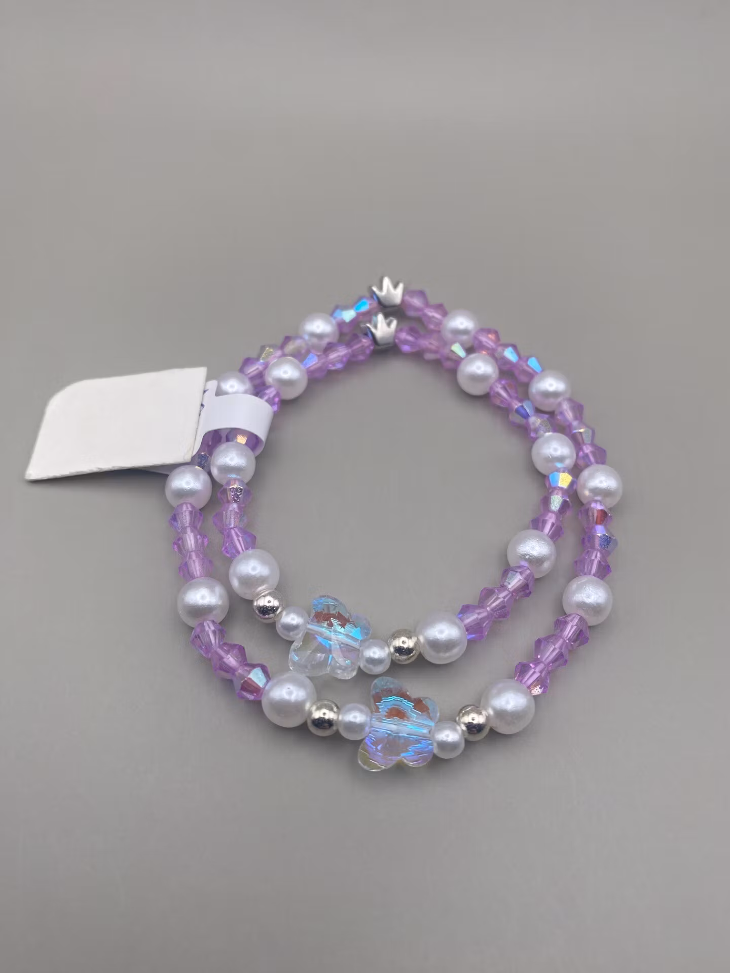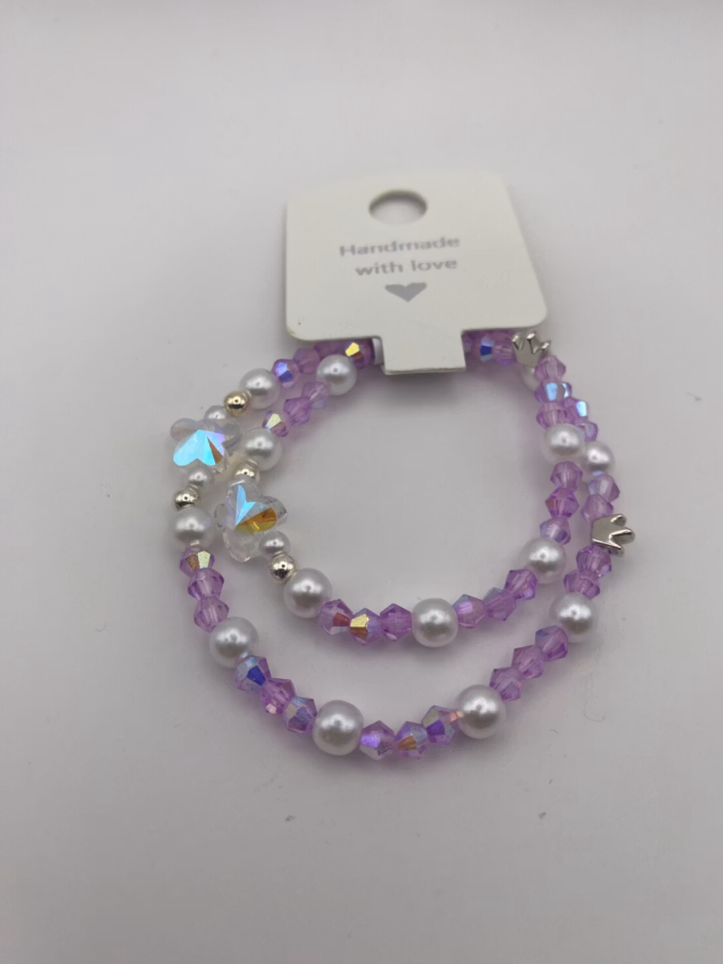 Två likadana armband i söt mix av härligt lila glaspärlor, enstaka silverfärgade pärlor varvat med vita pärlor. Perfekt att användas tillsammans på kalas och festligheter.