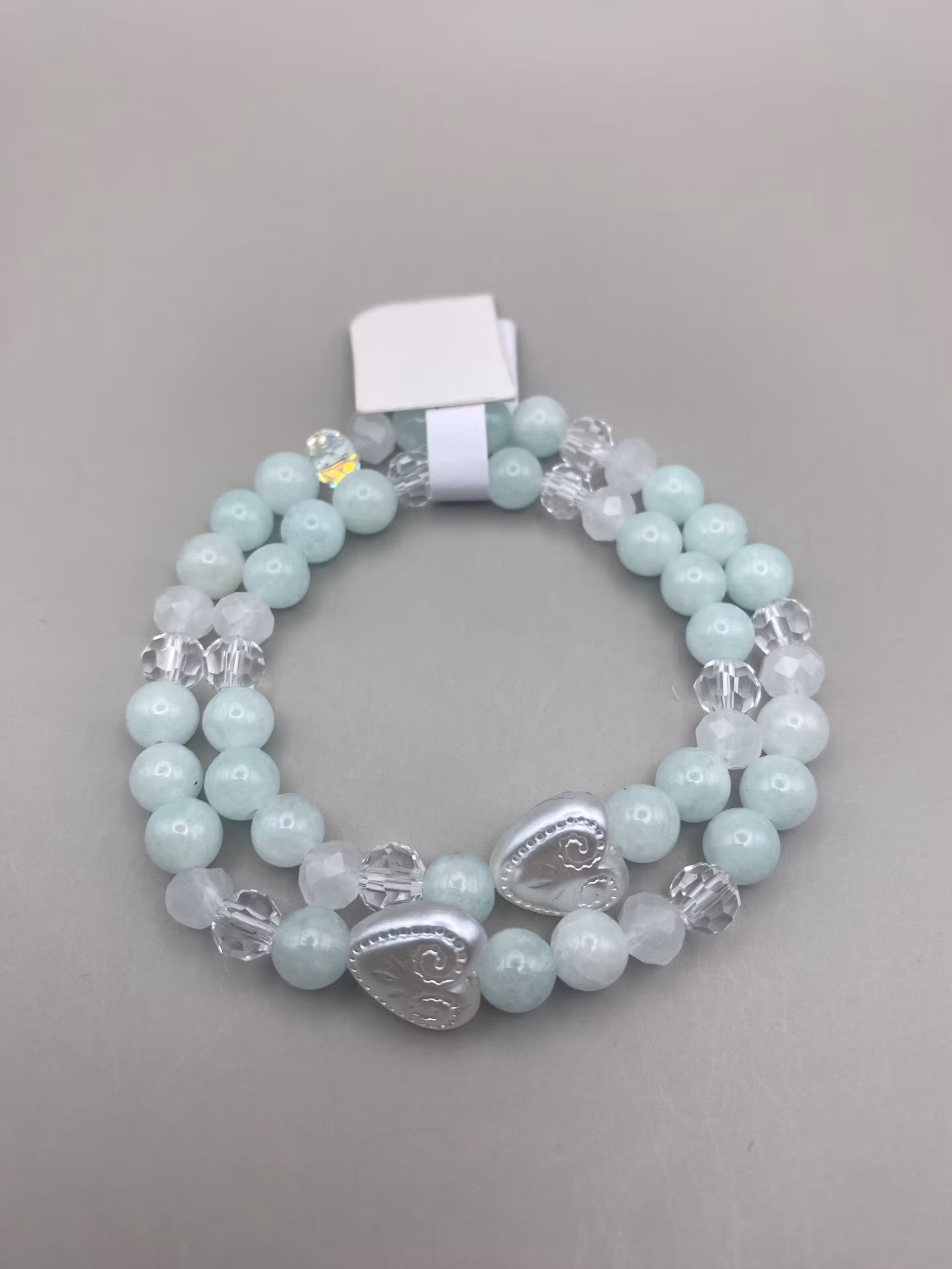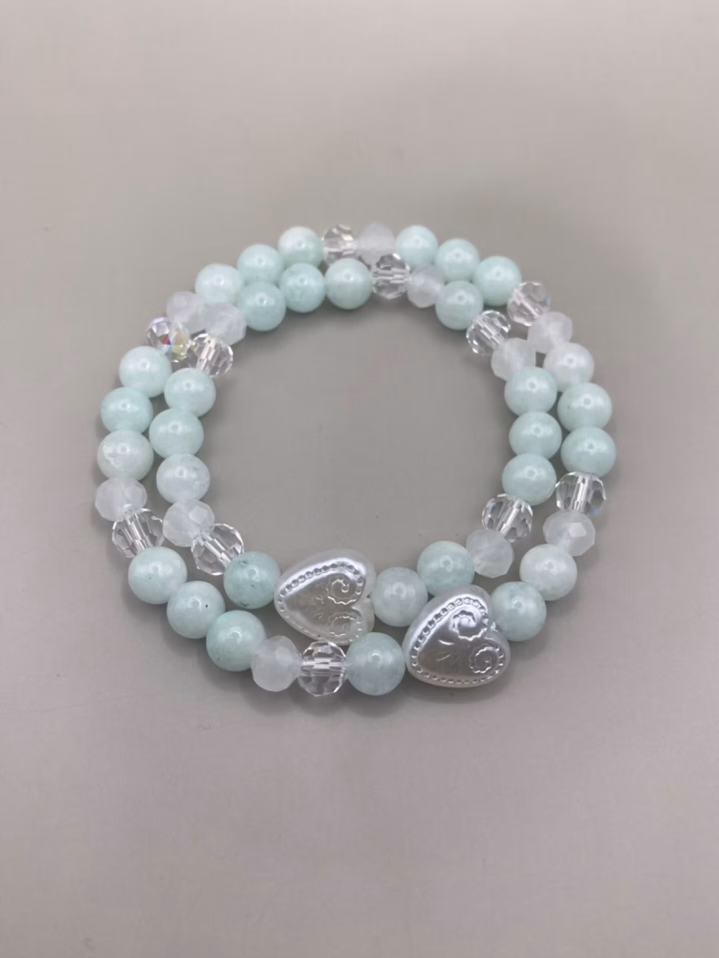 Två likadana armband i svagt ljusgröna runda glaspärlor varvat med genomskinliga skimrande glaspärlor och vitfrostade glaspärlor, fint vitt hjärta med mönster i