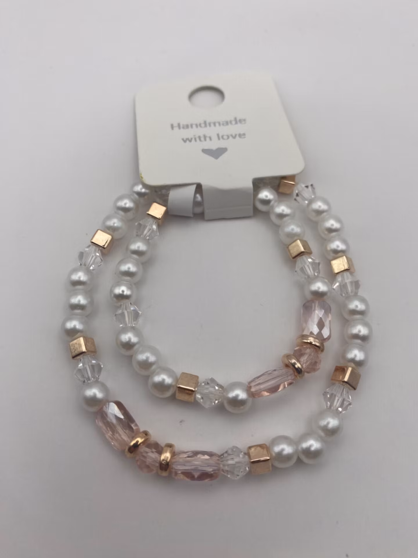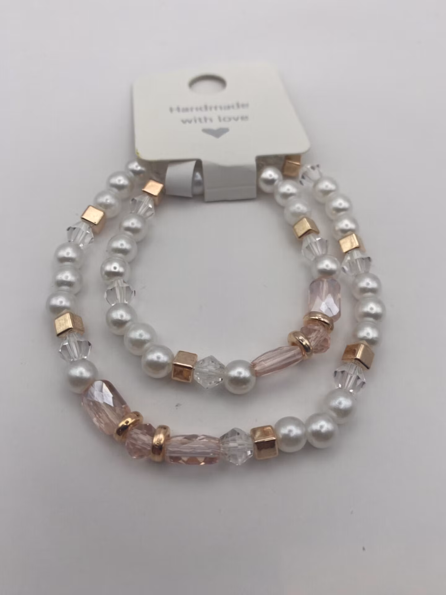 Två likadana armband i söt mix av vita pärlor, varvat med roséfärgade detaljer och ljusrosa glaspärlor, två större avlånga rosa glaspärlor i blickfånget. Perfek