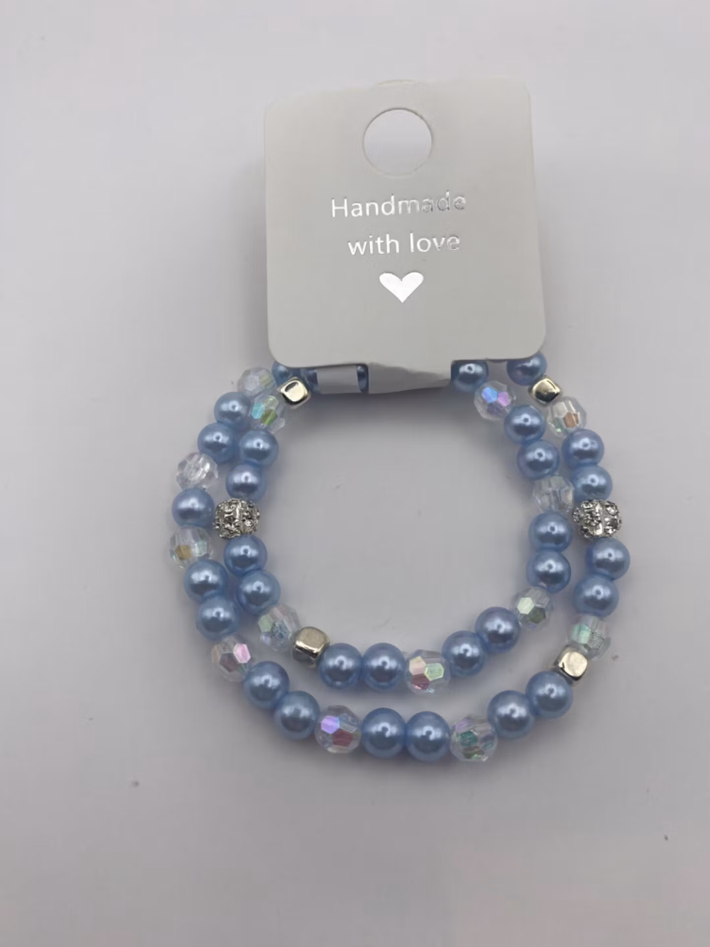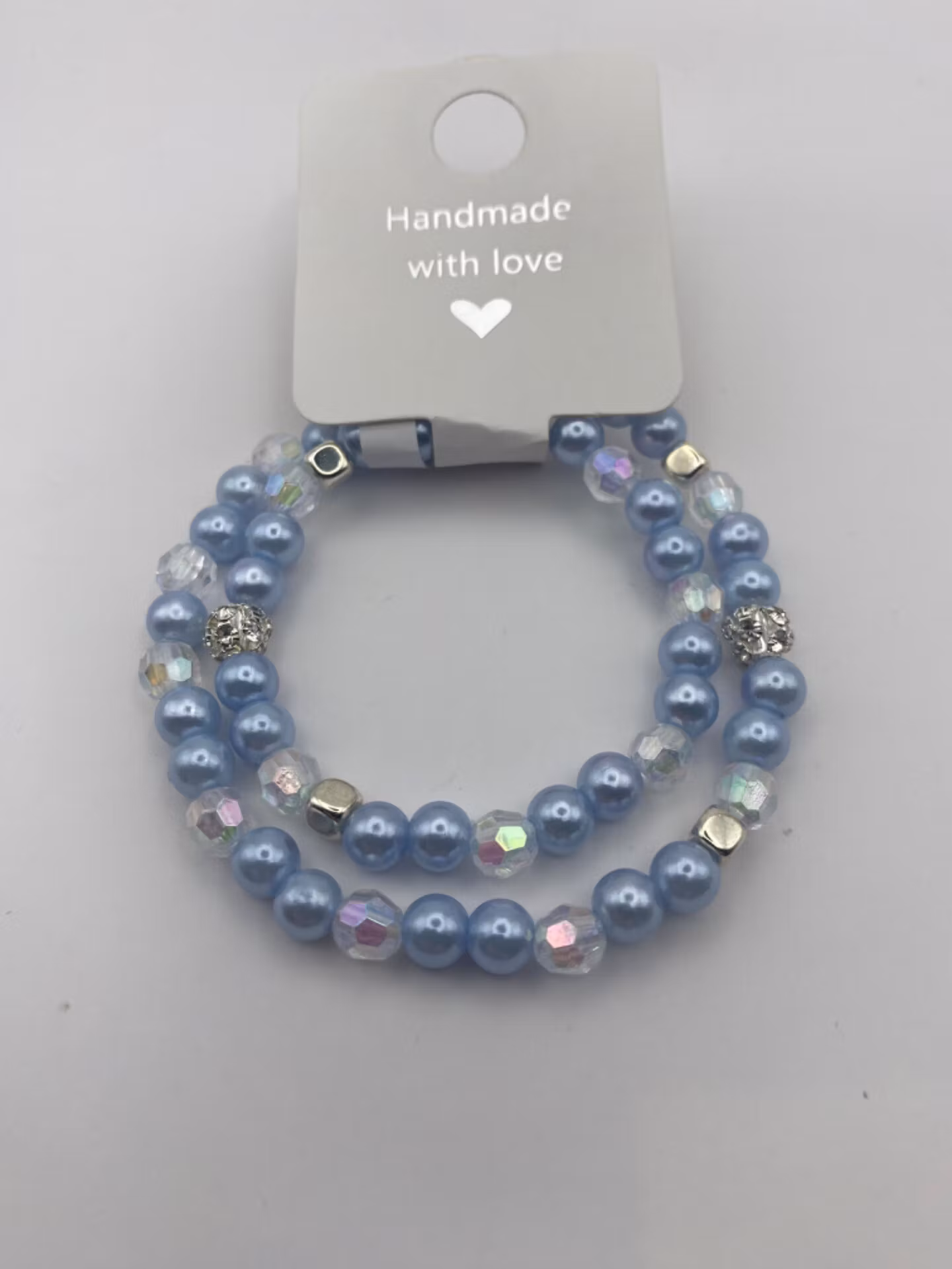 Två likadana armband i ljusblåa pärlor, varvat med genomskinliga glaspärlor och silverfärgade detaljer, samt liten glitterboll i blickfånget. Perfekt att använd