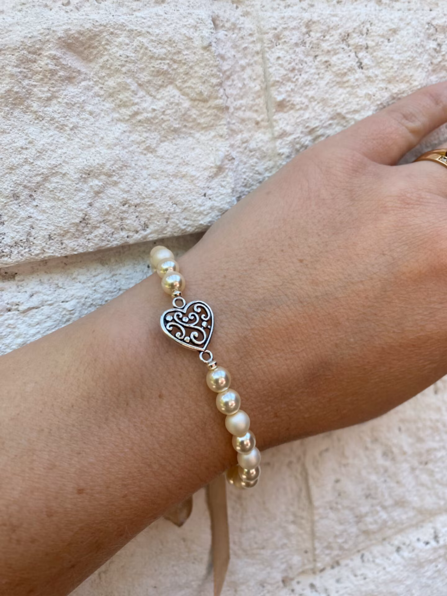 Armband i eleganta begia glansiga pärlor varvat med matta beiga pärloor, fin medaljong av hjärta i blickfånget. Rosett av beige satin/sidenband baktill. Kan tas