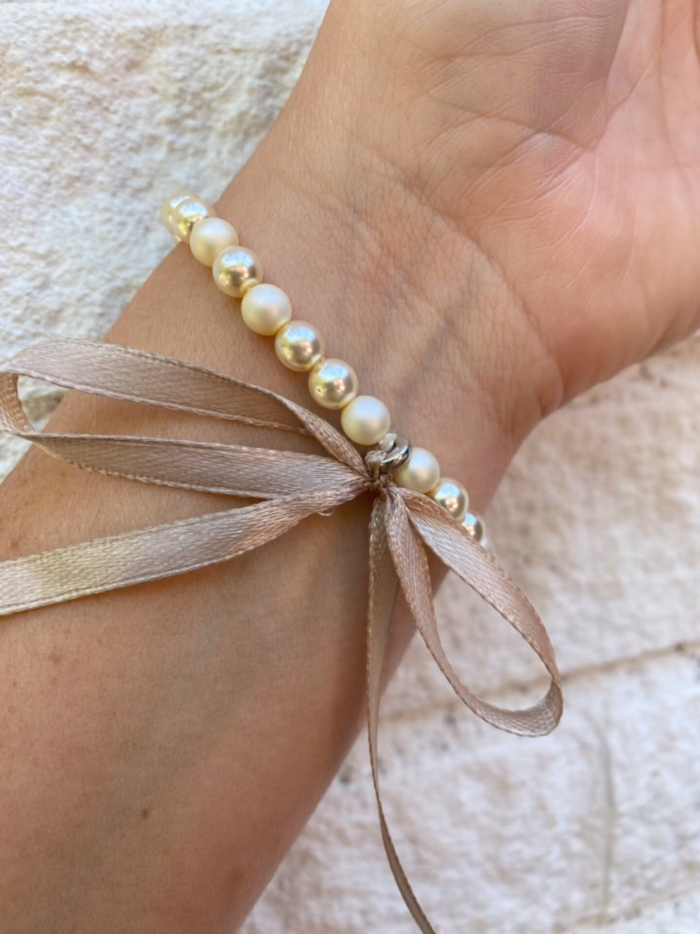 Armband i eleganta begia glansiga pärlor varvat med matta beiga pärloor, fin medaljong av hjärta i blickfånget. Rosett av beige satin/sidenband baktill. Kan tas av om önskas