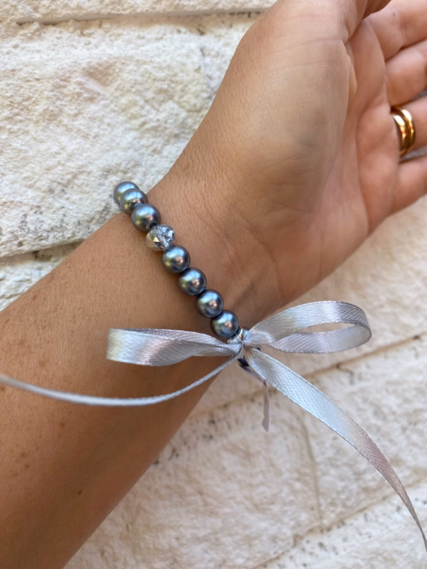 Armband i mörkare silvergrå glansiga pärlor, varvat med gråsilver glaspälor, fin medaljong/bricka med texten LOVE i blickfånget. Rosett av silvergrå satin/sidenband baktill. Kan tas av om önskas