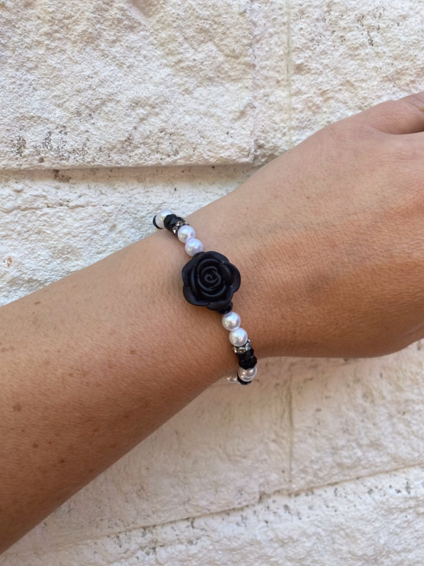 Armband i varvat svarta och vita pärlor, mörkgrå strass och stor svart ros i blickfånget.
